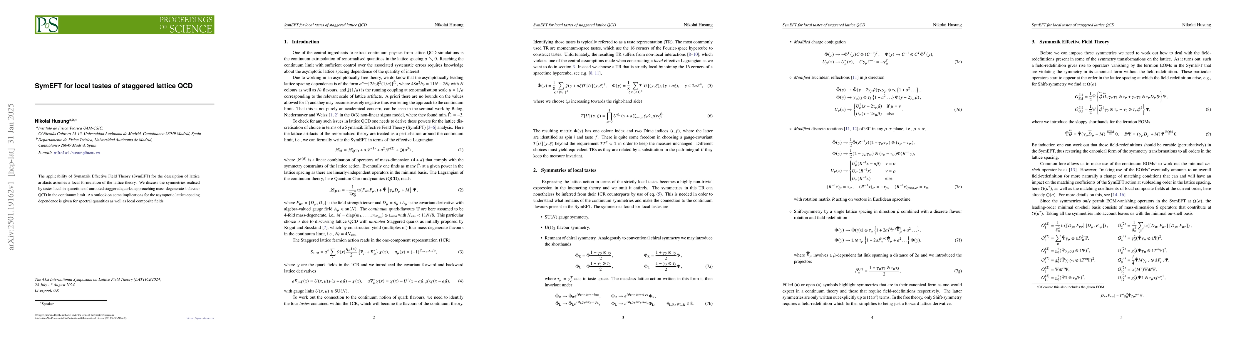 SymEFT is applied to a local formulation of staggered lattice QCD to address lattice artifacts, focusing on the symmetries of unrooted staggered quarks in a mass-degenerate 4-flavour continuum limit, with implications for spectral quantities and local composite fields.