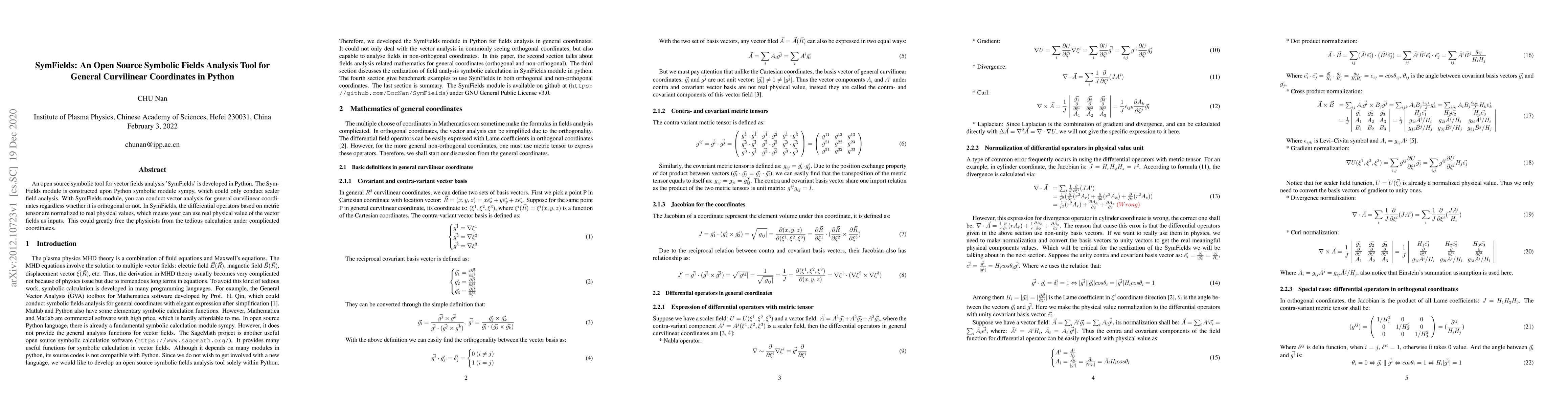 SymFields is an open-source Python tool for vector field analysis in general curvilinear coordinates, extending sympy's capabilities. It normalizes differential operators using metric tensors for real physical values, easing complex calculations for physicists.