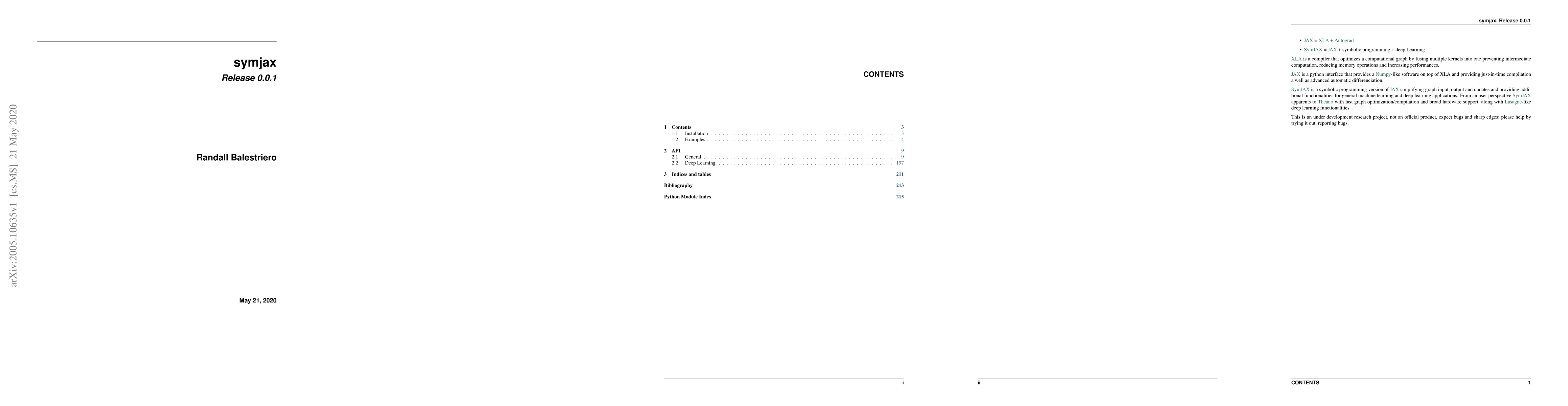 SymJAX is a symbolic programming version of JAX simplifying graph input/output/updates and providing additional functionalities for general machine learning and deep learning applications. From an user perspective SymJAX provides a la Theano experience with fast graph optimization/compilation and broad hardware support, along with Lasagne-like deep learning functionalities.
