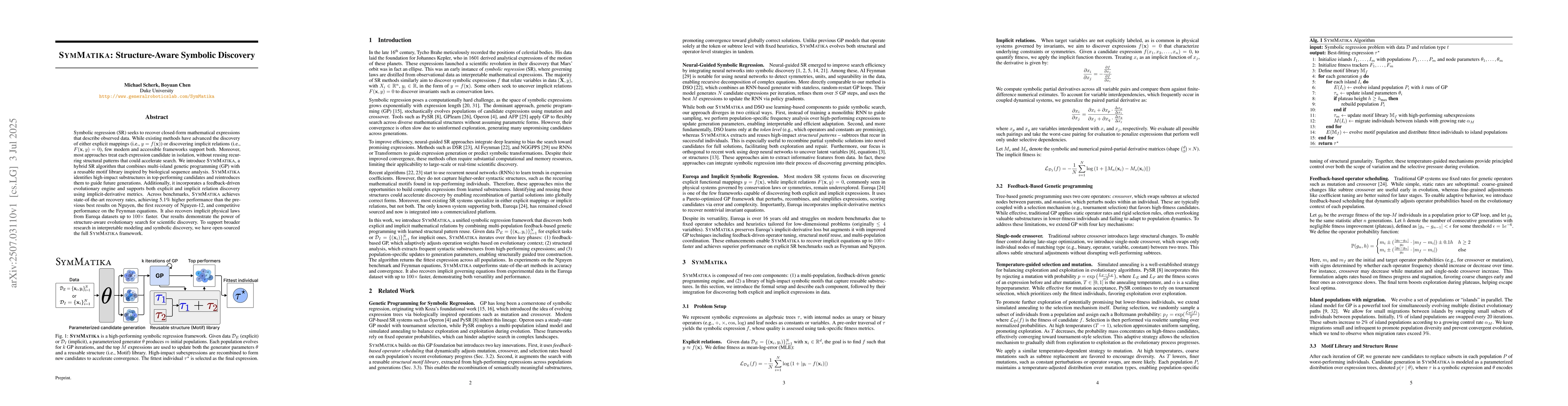 Symbolic regression (SR) seeks to recover closed-form mathematical expressions that describe observed data. While existing methods have advanced the discovery of either explicit mappings (i.e., $y = f(\mathbf{x})$) or discovering implicit relations (i.e., $F(\mathbf{x}, y)=0$), few modern and accessible frameworks support both. Moreover, most approaches treat each expression candidate in isolation, without reusing recurring structural patterns that could accelerate search. We introduce SymMatika, a hybrid SR algorithm that combines multi-island genetic programming (GP) with a reusable motif library inspired by biological sequence analysis. SymMatika identifies high-impact substructures in top-performing candidates and reintroduces them to guide future generations. Additionally, it incorporates a feedback-driven evolutionary engine and supports both explicit and implicit relation discovery using implicit-derivative metrics. Across benchmarks, SymMatika achieves state-of-the-art recovery rates, achieving 5.1% higher performance than the previous best results on Nguyen, the first recovery of Nguyen-12, and competitive performance on the Feynman equations. It also recovers implicit physical laws from Eureqa datasets up to $100\times$ faster. Our results demonstrate the power of structure-aware evolutionary search for scientific discovery. To support broader research in interpretable modeling and symbolic discovery, we have open-sourced the full SymMatika framework.