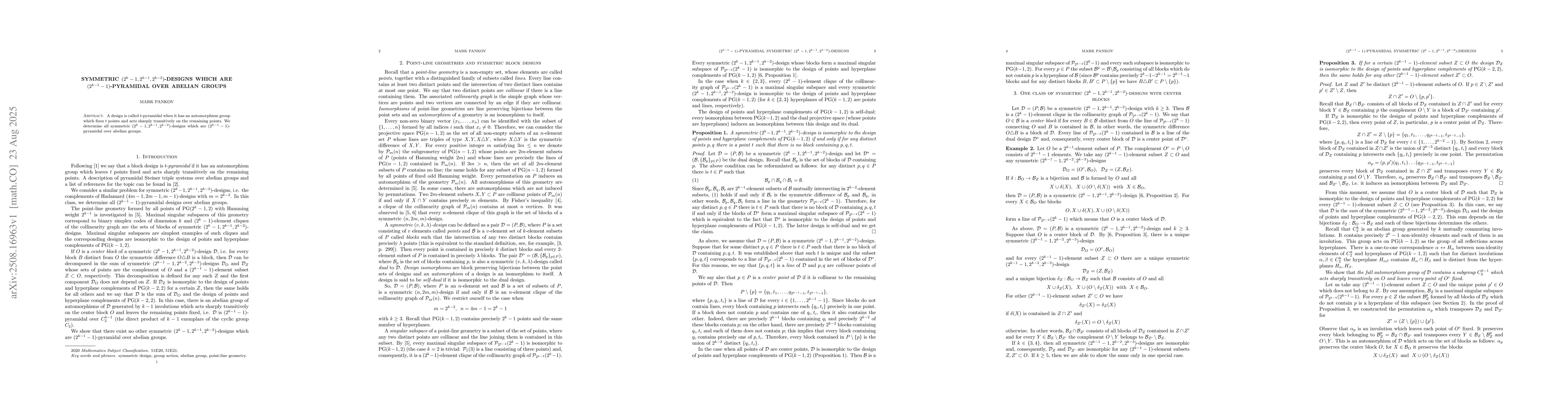 A design is called $t$-pyramidal when it has an automorphism group which fixes $t$ points and acts sharply transitively on the remaining points. We determine all symmetric $(2^k-1,2^{k-1},2^{k-2})$-designs which are $(2^{k-1}-1)$-pyramidal over abelian groups.