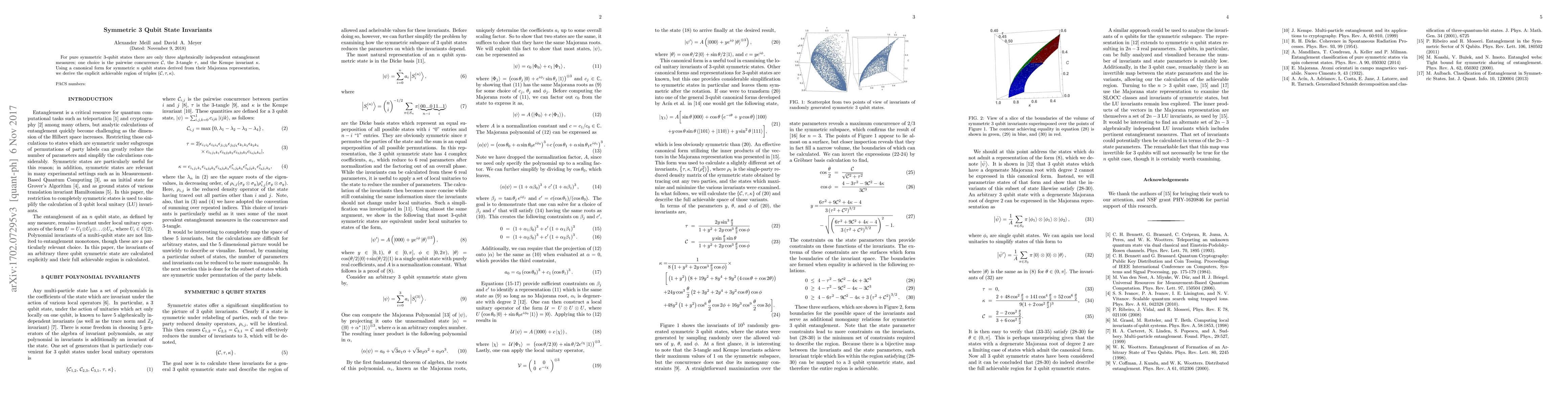 For pure symmetric 3-qubit states there are only three algebraically independent entanglement measures; one choice is the pairwise concurrence $\mathcal C$, the 3-tangle $\tau$, and the Kempe invariant $\kappa$. Using a canonical form for symmetric $N$-qubit states derived from their Majorana representation, we derive the explicit achievable region of triples $(\mathcal C,\tau,\kappa)$.