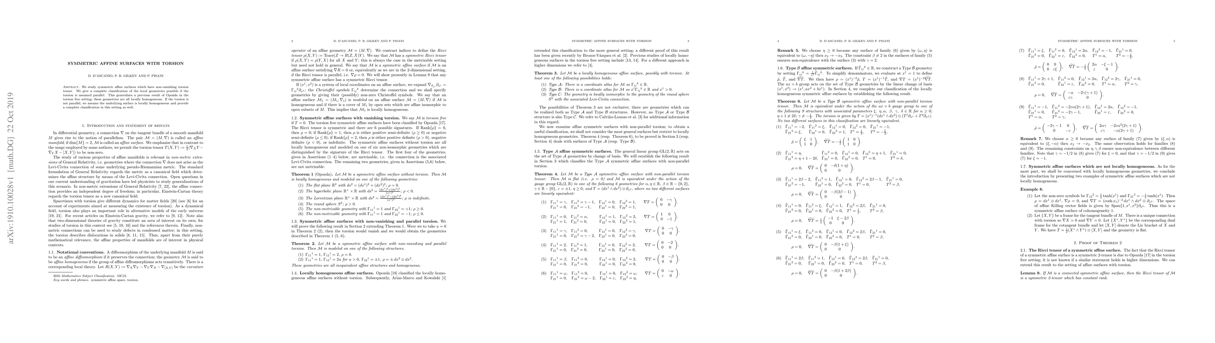 Researchers classify symmetric affine surfaces with torsion tensor into two categories: those where torsion is parallel and locally homogeneous, and those where torsion is not parallel but the surface remains locally homogeneous.