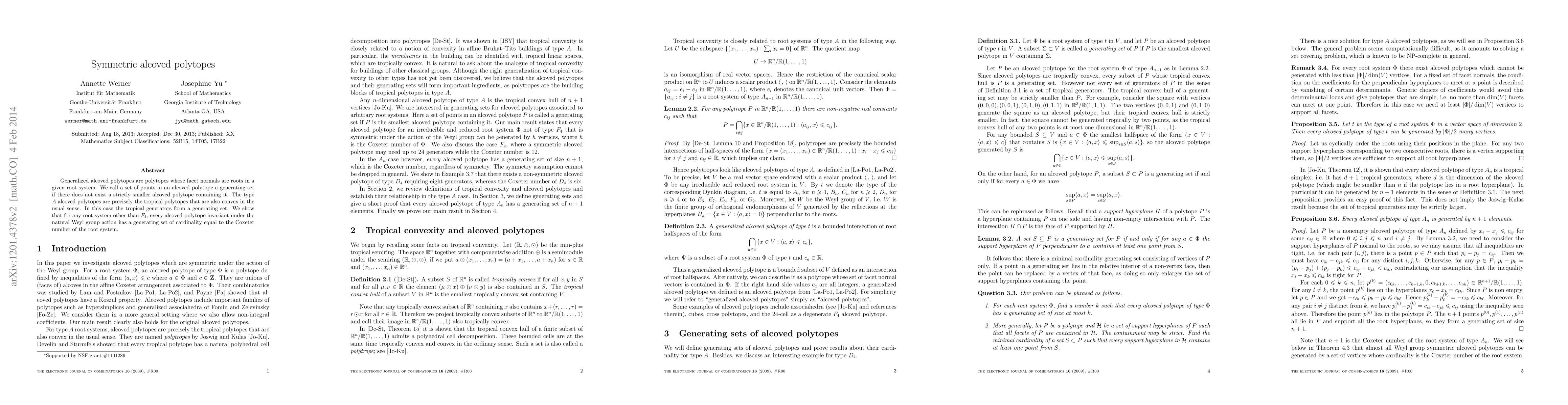 This paper investigates generalized symmetric alcoved polytopes, showing that type $A$ alcoved polytopes are tropical polytopes that are also classically convex. It proves that for any root system except $F_4$, any invariant alcoved polytope has a generating set size equivalent to the Coxeter number of the respective root system.