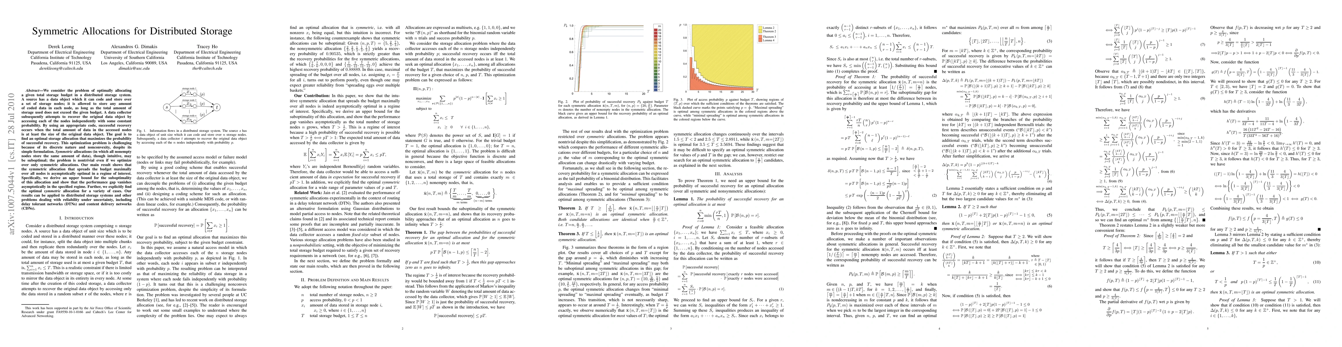 This paper investigates the optimal allocation of a storage budget in distributed storage systems to maximize recovery probability. It demonstrates that the symmetric allocation strategy, which distributes the storage budget equally among nodes, is asymptotically optimal in certain conditions, providing an upper bound for its suboptimality and showing that the performance gap diminishes as the system scales.
