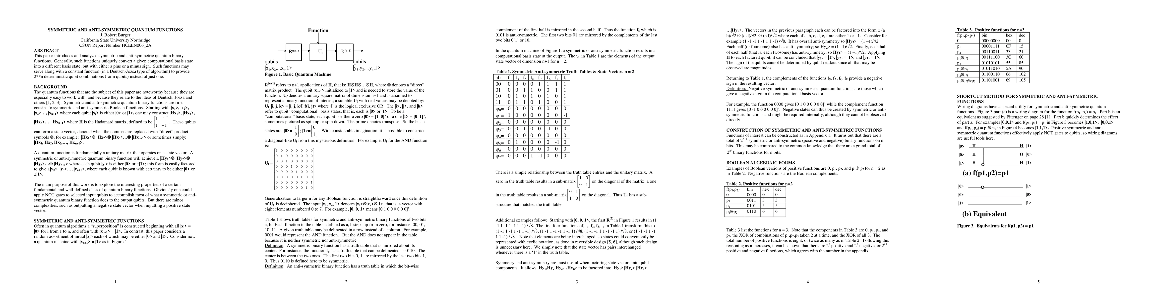 This paper explores symmetric and anti-symmetric quantum binary functions that transform computational basis states with a plus or minus sign, enhancing Deutsch-Jozsa algorithms to yield 2**n deterministic qubit combinations.
