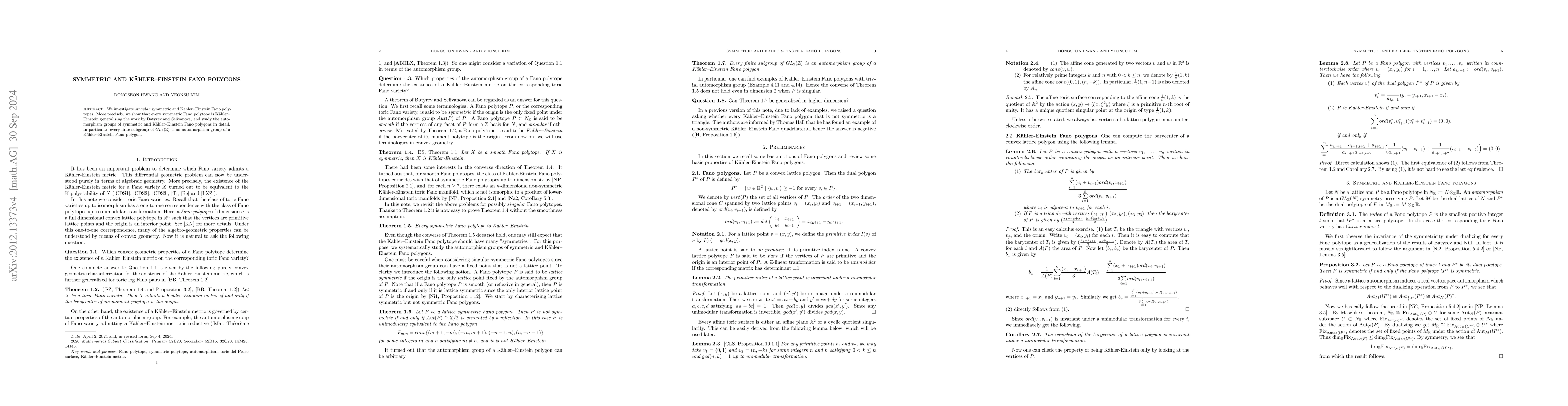 We investigate singular symmetric and K\"ahler--Einstein Fano polytopes. In particular we study the automorphism groups of symmetric and K\"ahler--Einstein Fano polygons in detail.