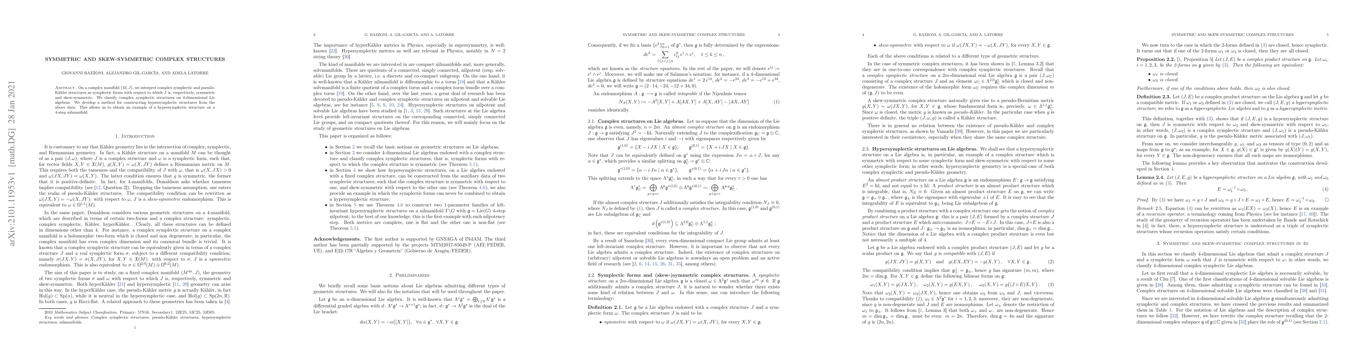 This paper explores complex symplectic and pseudo-Kähler structures on complex manifolds, classifying them on 4-dimensional Lie algebras and constructing hypersymplectic structures, ultimately providing an example on a 4-step nilmanifold.