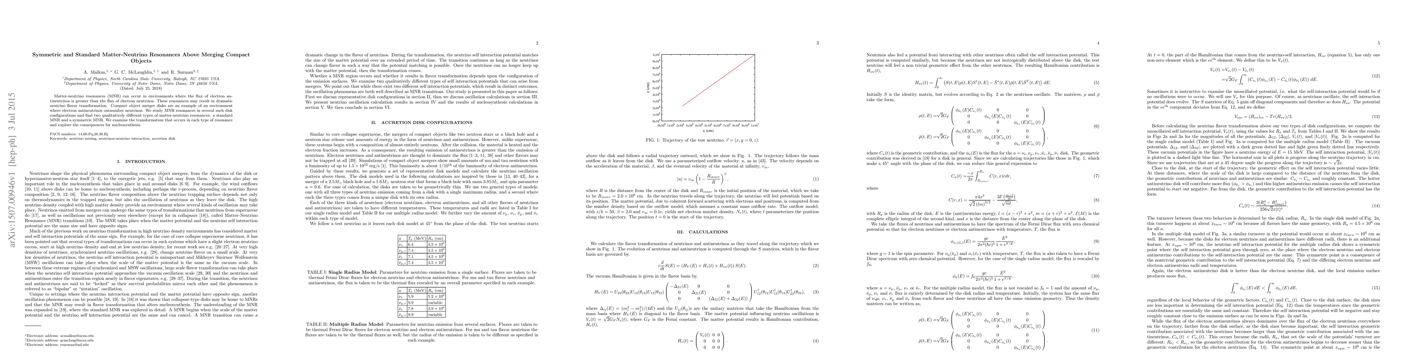 Matter-neutrino resonances (MNR) can occur in environments where the flux of electron antineutrinos is greater than the flux of electron neutrinos. These resonances may result in dramatic neutrino flavor transformation. Compact object merger disks are an example of an environment where electron antineutrinos outnumber neutrinos. We study MNR resonances in several such disk configurations and find two qualitatively different types of matter-neutrino resonances: a standard MNR and a symmetric MNR. We examine the transformation that occurs in each type of resonance and explore the consequences for nucleosynthesis.