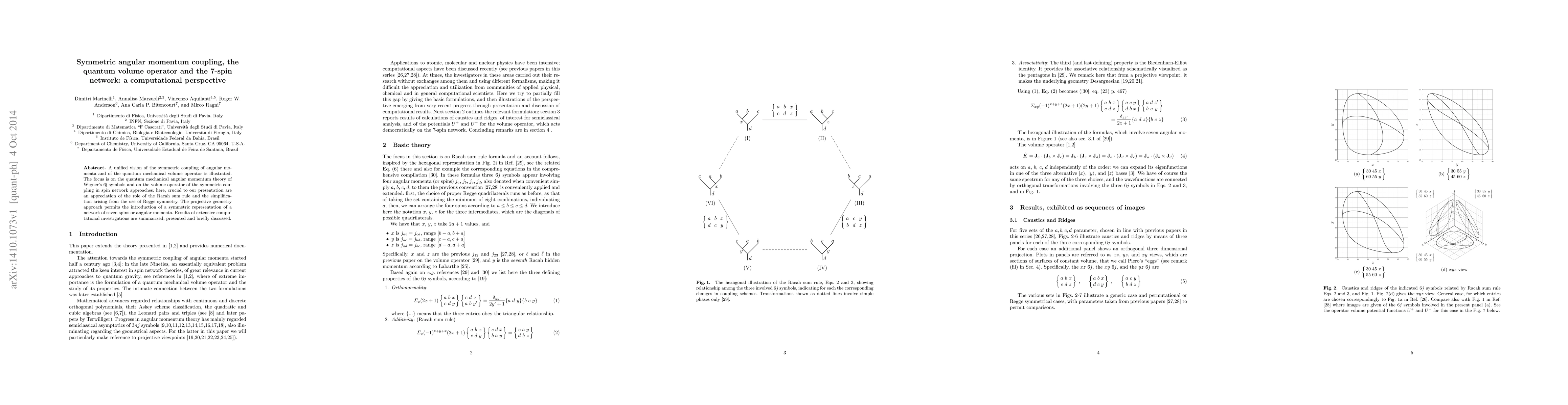 A unified vision of the symmetric coupling of angular momenta and of the quantum mechanical volume operator is illustrated. The focus is on the quantum mechanical angular momentum theory of Wigner's 6j symbols and on the volume operator of the symmetric coupling in spin network approaches: here, crucial to our presentation are an appreciation of the role of the Racah sum rule and the simplification arising from the use of Regge symmetry. The projective geometry approach permits the introduction of a symmetric representation of a network of seven spins or angular momenta. Results of extensive computational investigations are summarized, presented and briefly discussed.