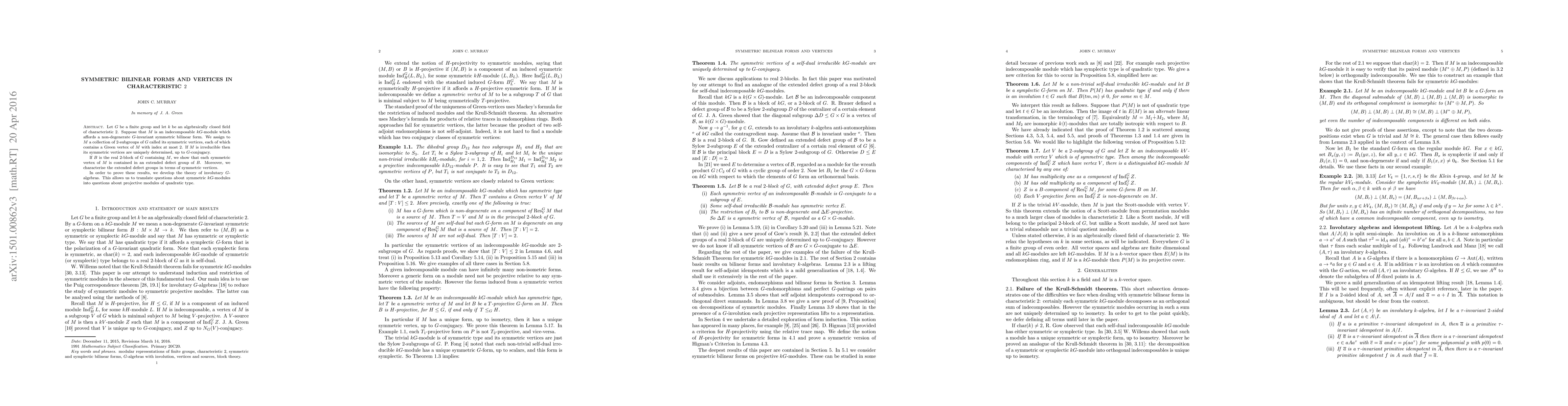 This paper studies indecomposable $kG$-modules with non-degenerate symmetric bilinear forms over a field $k$ of characteristic 2, introducing symmetric vertices, which are $2$-subgroups of $G$ related to Green vertices. It demonstrates that these vertices are contained in extended defect groups of $G$'s real $2$-block, and develops the theory of involutary $G$-algebras to analyze projective modules of quadratic type.