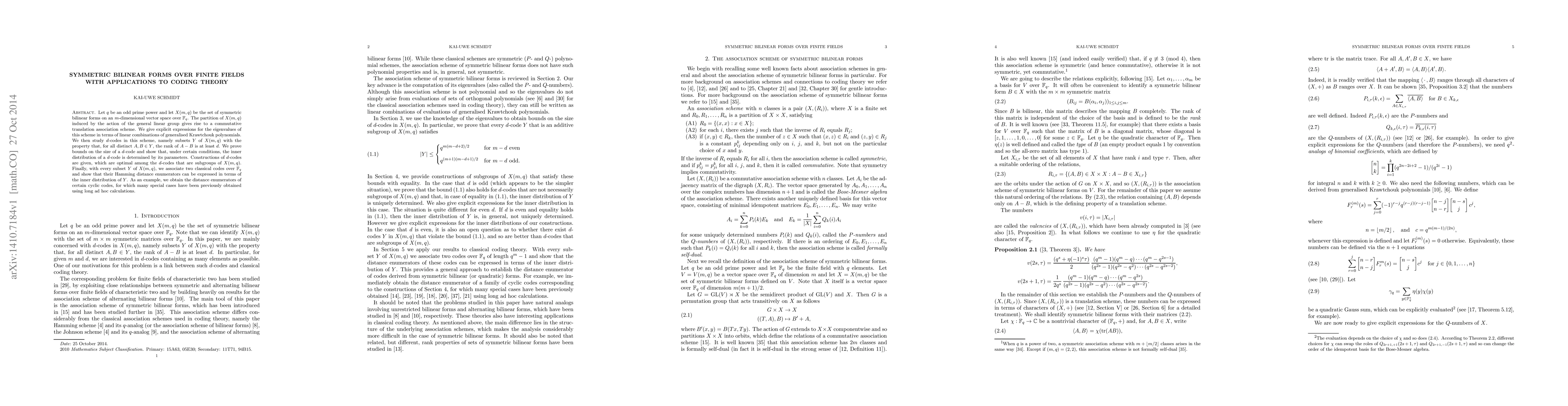 Let $q$ be an odd prime power and let $X(m,q)$ be the set of symmetric bilinear forms on an $m$-dimensional vector space over $\mathbb{F}_q$. The partition of $X(m,q)$ induced by the action of the general linear group gives rise to a commutative translation association scheme. We give explicit expressions for the eigenvalues of this scheme in terms of linear combinations of generalised Krawtchouk polynomials. We then study $d$-codes in this scheme, namely subsets $Y$ of $X(m,q)$ with the property that, for all distinct $A,B\in Y$, the rank of $A-B$ is at least $d$. We prove bounds on the size of a $d$-code and show that, under certain conditions, the inner distribution of a $d$-code is determined by its parameters. Constructions of $d$-codes are given, which are optimal among the $d$-codes that are subgroups of $X(m,q)$. Finally, with every subset $Y$ of $X(m,q)$, we associate two classical codes over $\mathbb{F}_q$ and show that their Hamming distance enumerators can be expressed in terms of the inner distribution of $Y$. As an example, we obtain the distance enumerators of certain cyclic codes, for which many special cases have been previously obtained using long ad hoc calculations.