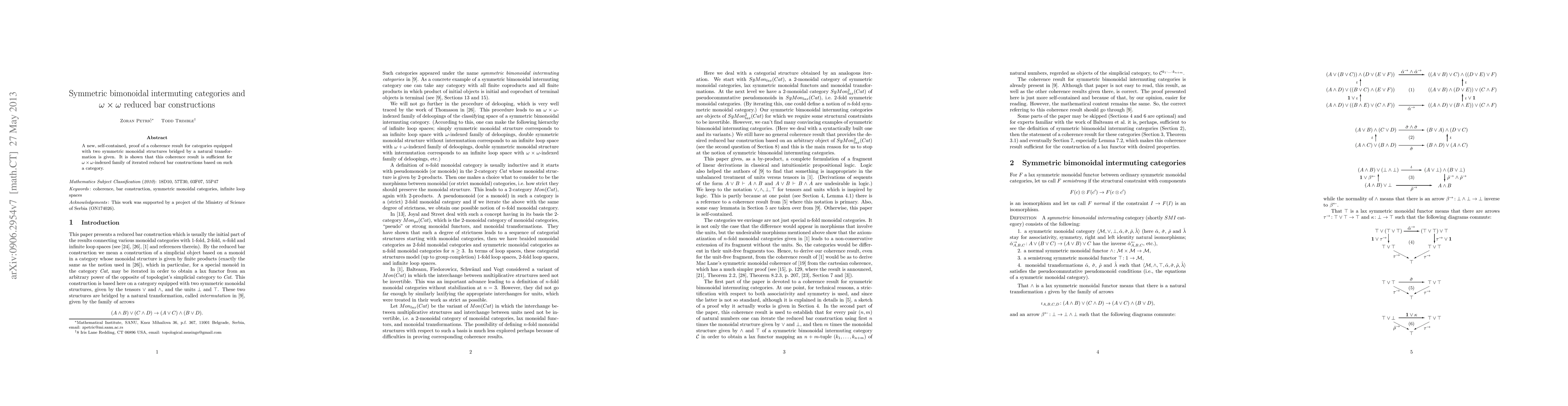 A new, self-contained, proof of a coherence result for categories equipped with two symmetric monoidal structures bridged by a natural transformation is given. It is shown that this coherence result is sufficient for $\omega\times\omega$-indexed family of iterated reduced bar constructions based on such a category.