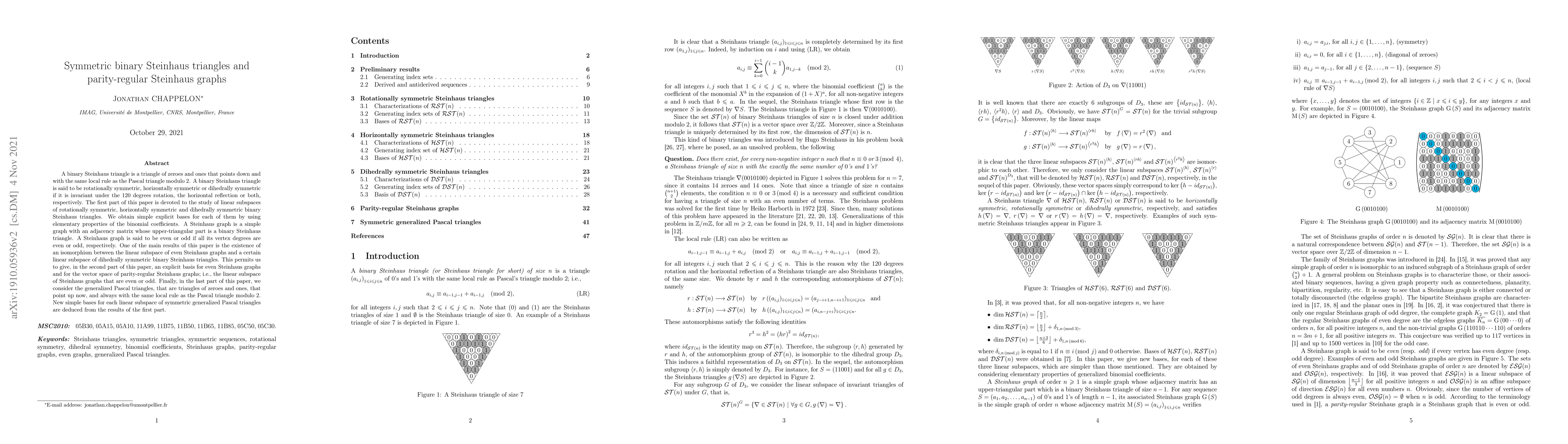 A binary Steinhaus triangle is a triangle of zeroes and ones that points down and with the same local rule as the Pascal triangle modulo 2. A binary Steinhaus triangle is said to be rotationally symmetric, horizontally symmetric or dihedrally symmetric if it is invariant under the 120 degrees rotation, the horizontal reflection or both, respectively. The first part of this paper is devoted to the study of linear subspaces of rotationally symmetric, horizontally symmetric and dihedrally symmetric binary Steinhaus triangles. We obtain simple explicit bases for each of them by using elementary properties of the binomial coefficients. A Steinhaus graph is a simple graph with an adjacency matrix whose upper-triangular part is a binary Steinhaus triangle. A Steinhaus graph is said to be even or odd if all its vertex degrees are even or odd, respectively. One of the main results of this paper is the existence of an isomorphism between the linear subspace of even Steinhaus graphs and a certain linear subspace of dihedrally symmetric binary Steinhaus triangles. This permits us to give, in the second part of this paper, an explicit basis for even Steinhaus graphs and for the vector space of parity-regular Steinhaus graphs; i.e., the linear subspace of Steinhaus graphs that are even or odd. Finally, in the last part of this paper, we consider the generalized Pascal triangles, that are triangles of zeroes and ones, that point up now, and always with the same local rule as the Pascal triangle modulo 2. New simple bases for each linear subspace of symmetric generalized Pascal triangles are deduced from the results of the first part.