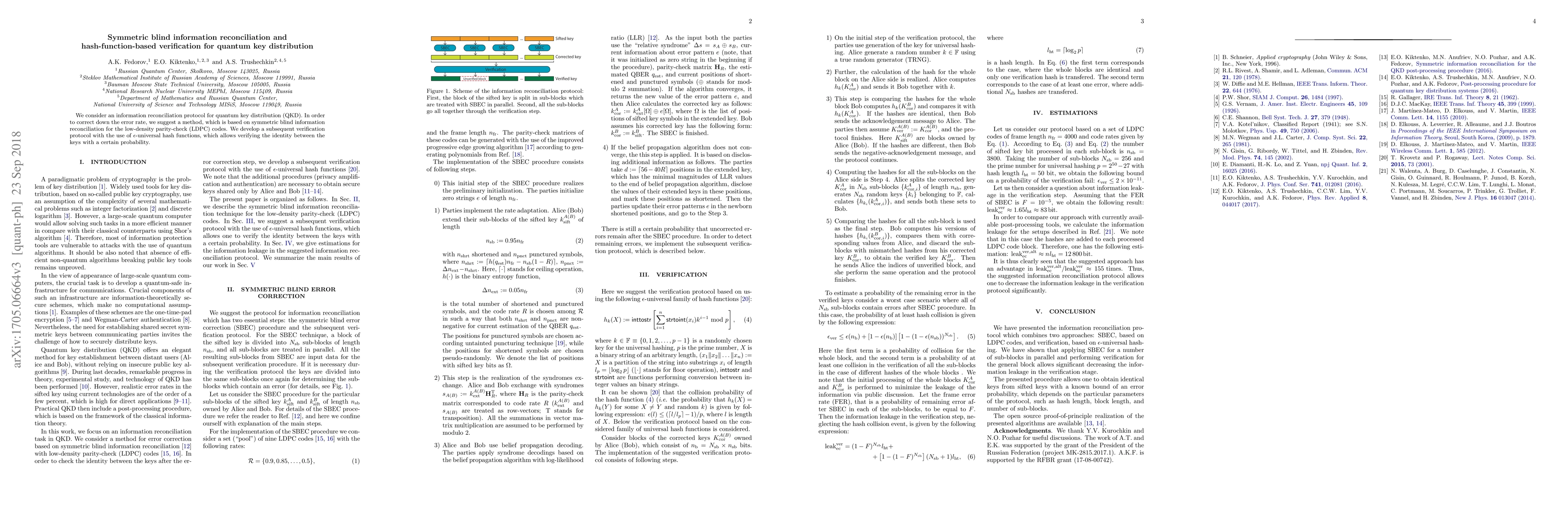 This paper proposes a symmetric blind information reconciliation method using low-density parity-check codes for error correction in quantum key distribution (QKD). It also introduces an $\epsilon$-universal hash function-based verification protocol to confirm the identity between the generated keys with a specified probability.