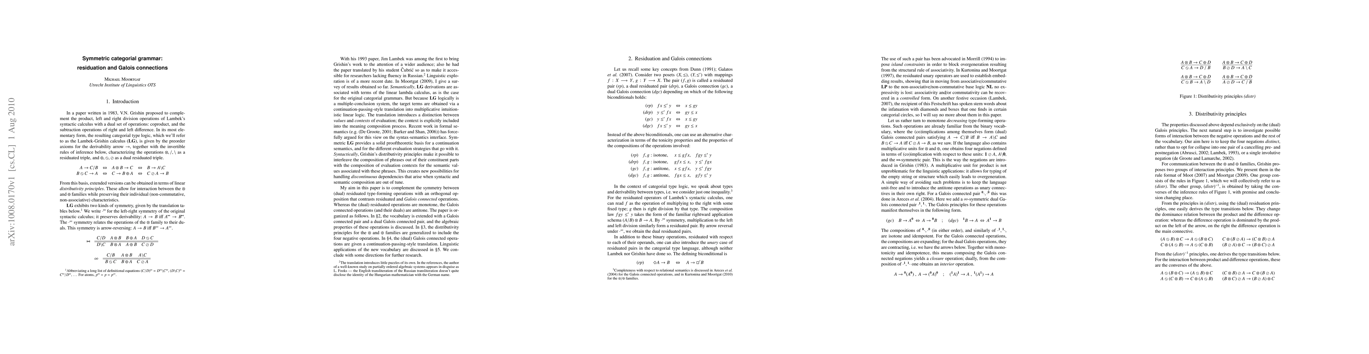 The Lambek-Grishin calculus is a symmetric extension of the Lambek calculus: in addition to the residuated family of product, left and right division operations of Lambek's original calculus, one also considers a family of coproduct, right and left difference operations, related to the former by an arrow-reversing duality. Communication between the two families is implemented in terms of linear distributivity principles. The aim of this paper is to complement the symmetry between (dual) residuated type-forming operations with an orthogonal opposition that contrasts residuated and Galois connected operations. Whereas the (dual) residuated operations are monotone, the Galois connected operations (and their duals) are antitone. We discuss the algebraic properties of the (dual) Galois connected operations, and generalize the (co)product distributivity principles to include the negative operations. We give a continuation-passing-style translation for the new type-forming operations, and discuss some linguistic applications.