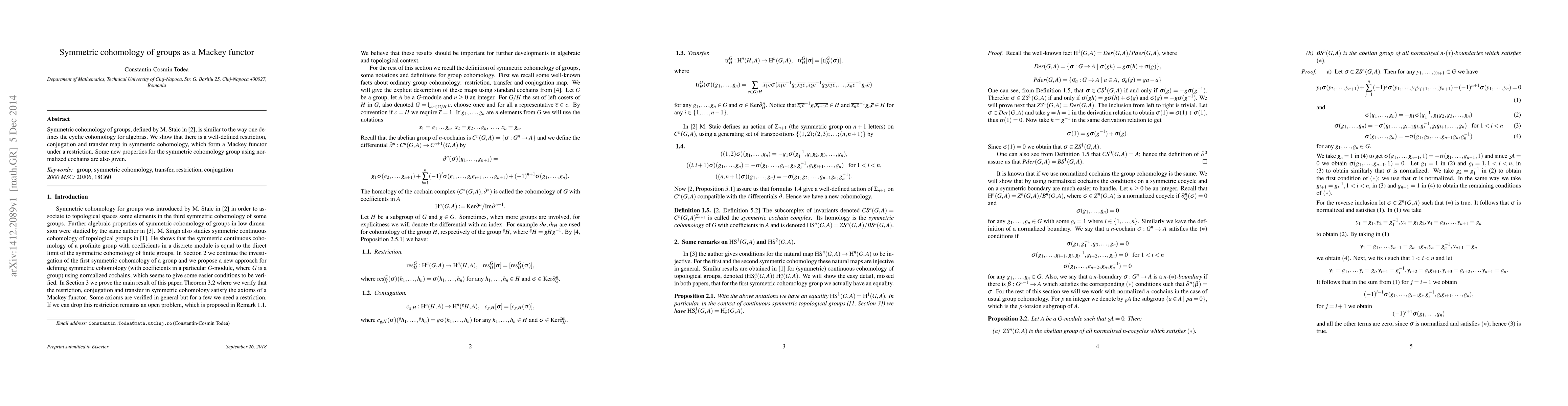 This paper demonstrates that symmetric cohomology of groups, akin to cyclic cohomology for algebras, forms a Mackey functor with well-defined restriction, conjugation, and transfer maps. Additionally, it introduces new properties for the symmetric cohomology group utilizing normalized cochains.