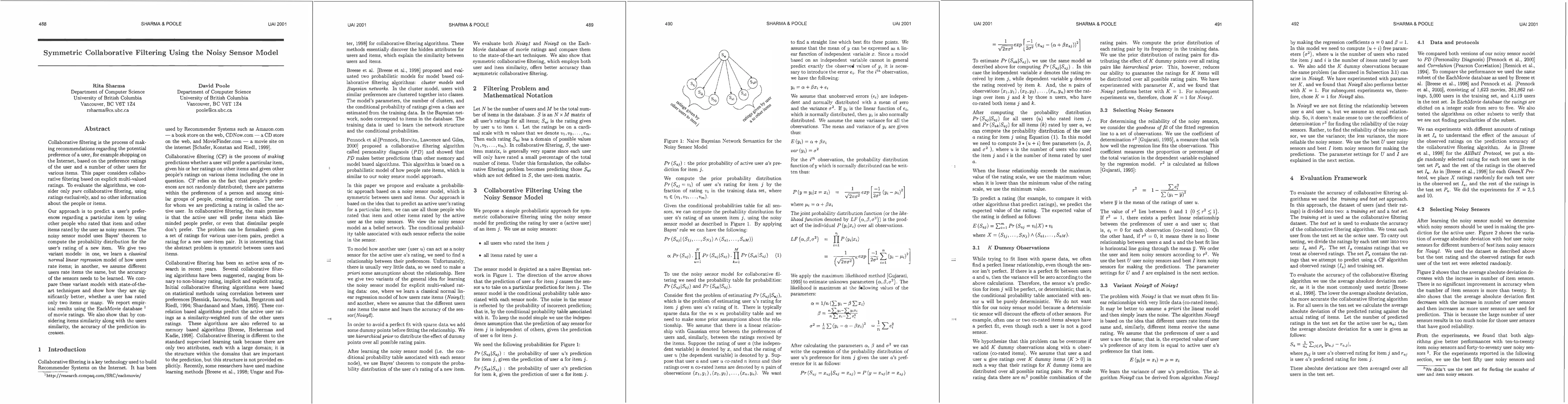 Collaborative filtering is the process of making recommendations regarding the potential preference of a user, for example shopping on the Internet, based on the preference ratings of the user and a number of other users for various items. This paper considers collaborative filtering based on explicitmulti-valued ratings. To evaluate the algorithms, weconsider only {em pure} collaborative filtering, using ratings exclusively, and no other information about the people or items.Our approach is to predict a user's preferences regarding a particularitem by using other people who rated that item and other items ratedby the user as noisy sensors. The noisy sensor model uses Bayes' theorem to compute the probability distribution for the user'srating of a new item. We give two variant models: in one, we learn a{em classical normal linear regression} model of how users rate items; in another,we assume different users rate items the same, but the accuracy of thesensors needs to be learned. We compare these variant models withstate-of-the-art techniques and show how they are significantly better,whether a user has rated only two items or many. We reportempirical results using the EachMovie database footnote{http://research.compaq.com/SRC/eachmovie/} of movie ratings. Wealso show that by considering items similarity along with theusers similarity, the accuracy of the prediction increases.