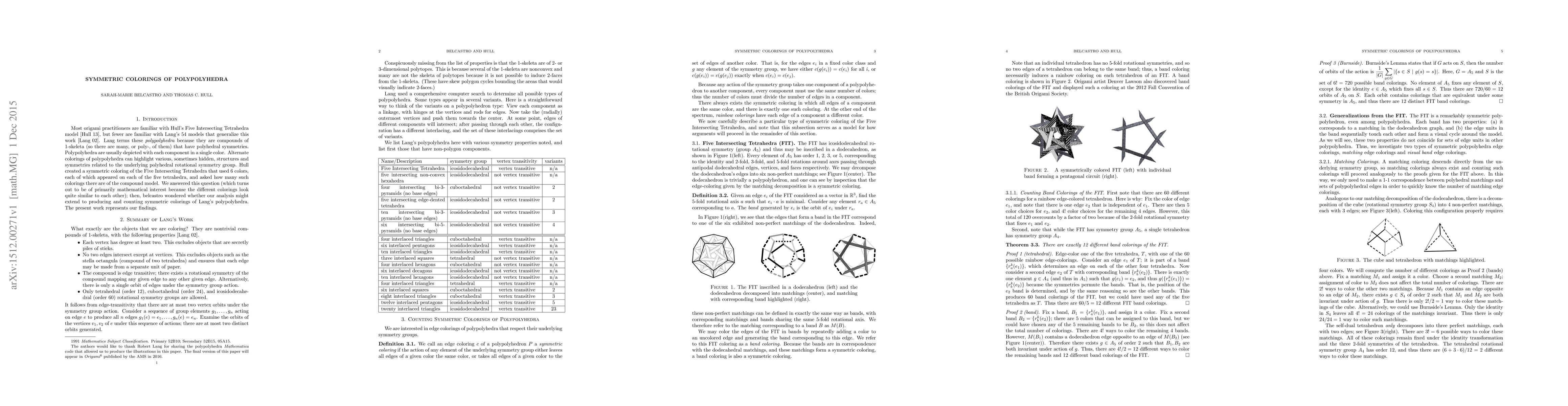 Polypolyhedra (after R. Lang) are compounds of edge-transitive 1-skeleta. There are 54 topologically different polypolyhedra, and each has icosidodecahedral, cuboctahedral, or tetrahedral symmetry, all are realizable as modular origami models with one module per skeleton edge. Consider a coloring in which each edge of a given component receives a different color, and where the coloring (up to global color permutation) is invariant under the polypolyhedron's symmetry group. On the Five Intersecting Tetrahedra, the edges of each color form visual bands on the model, and correspond to matchings on the dodecahedron graph. We count the number of such colorings and give three proofs. For each of the non-polygon-component polypolyhedra, there is a corresponding matching coloring, and we count the number of these matching colorings. For some of the non-polygon-component polypolyhedra, there is a corresponding visual-band coloring, and we count the number of these band colorings.