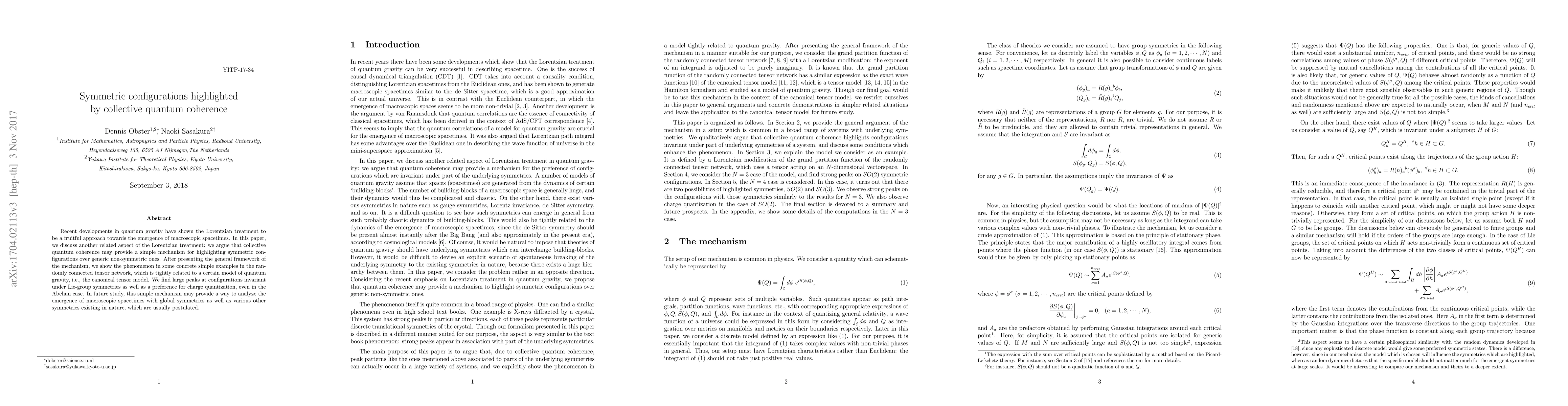 Recent developments in quantum gravity have shown the Lorentzian treatment to be a fruitful approach towards the emergence of macroscopic spacetimes. In this paper, we discuss another related aspect of the Lorentzian treatment: we argue that collective quantum coherence may provide a simple mechanism for highlighting symmetric configurations over generic non-symmetric ones. After presenting the general framework of the mechanism, we show the phenomenon in some concrete simple examples in the randomly connected tensor network, which is tightly related to a certain model of quantum gravity, i.e., the canonical tensor model. We find large peaks at configurations invariant under Lie-group symmetries as well as a preference for charge quantization, even in the Abelian case. In future study, this simple mechanism may provide a way to analyze the emergence of macroscopic spacetimes with global symmetries as well as various other symmetries existing in nature, which are usually postulated.