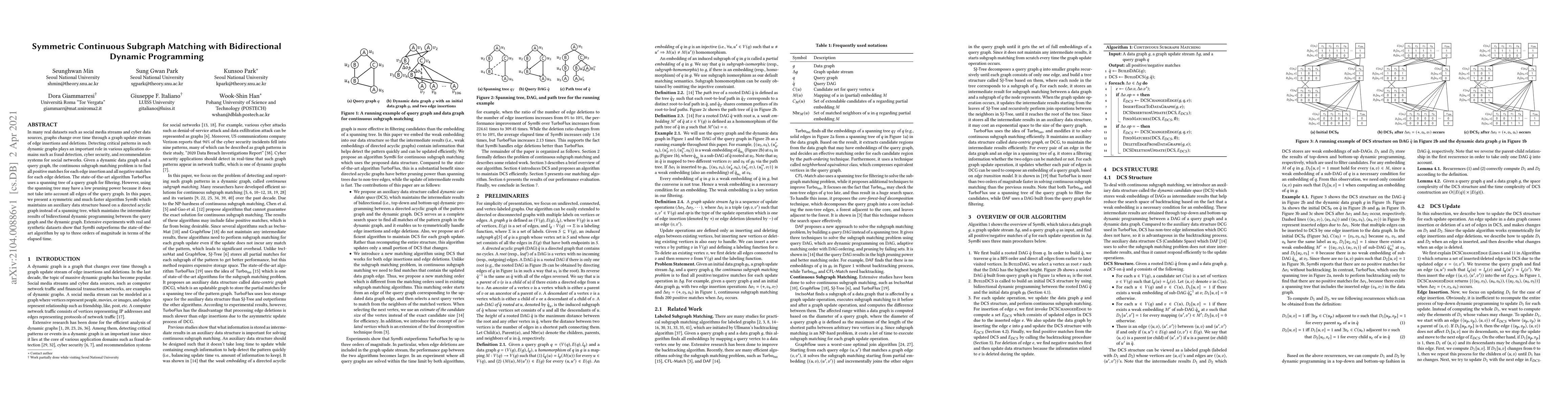 In many real datasets such as social media streams and cyber data sources, graphs change over time through a graph update stream of edge insertions and deletions. Detecting critical patterns in such dynamic graphs plays an important role in various application domains such as fraud detection, cyber security, and recommendation systems for social networks. Given a dynamic data graph and a query graph, the continuous subgraph matching problem is to find all positive matches for each edge insertion and all negative matches for each edge deletion. The state-of-the-art algorithm TurboFlux uses a spanning tree of a query graph for filtering. However, using the spanning tree may have a low pruning power because it does not take into account all edges of the query graph. In this paper, we present a symmetric and much faster algorithm SymBi which maintains an auxiliary data structure based on a directed acyclic graph instead of a spanning tree, which maintains the intermediate results of bidirectional dynamic programming between the query graph and the dynamic graph. Extensive experiments with real and synthetic datasets show that SymBi outperforms the state-of-the-art algorithm by up to three orders of magnitude in terms of the elapsed time.