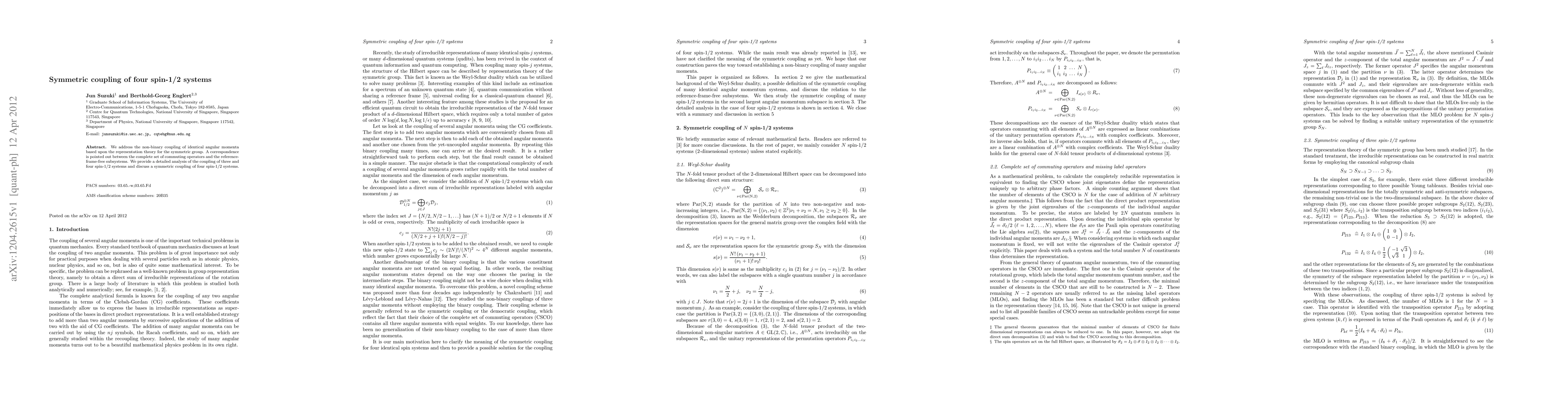 We address the non-binary coupling of identical angular momenta based upon the representation theory for the symmetric group. A correspondence is pointed out between the complete set of commuting operators and the reference-frame-free subsystems. We provide a detailed analysis of the coupling of three and four spin-1/2 systems and discuss a symmetric coupling of four spin-1/2 systems.