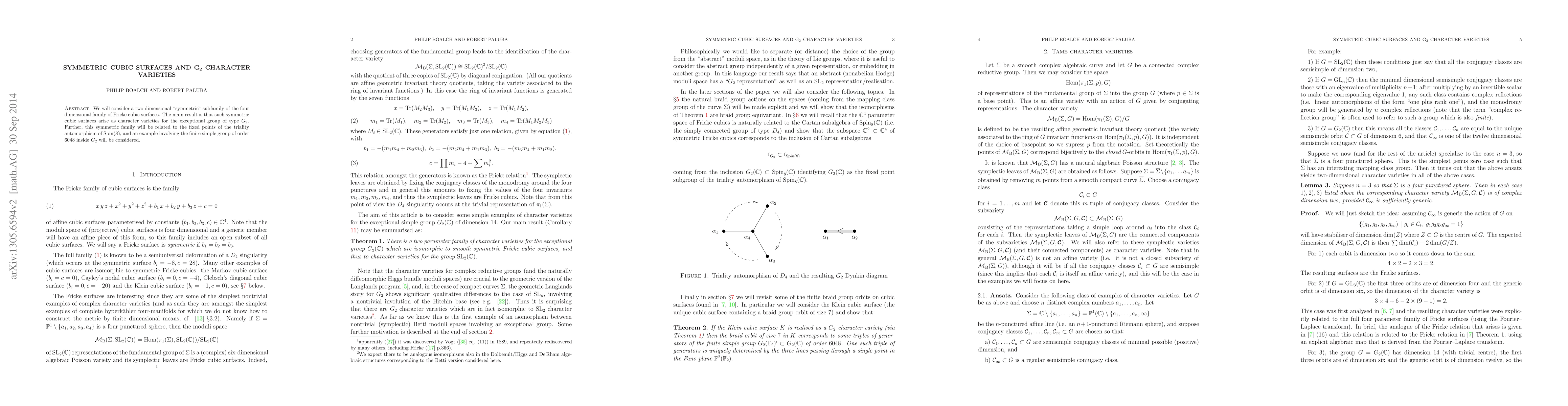 This paper explores a two-dimensional subfamily of Fricke cubic surfaces, demonstrating that these symmetric cubic surfaces correspond to character varieties for the exceptional group G_2. It also links this family to the fixed points of the triality automorphism of Spin(8) and examines a specific example involving the finite simple group of order 6048 within G_2.