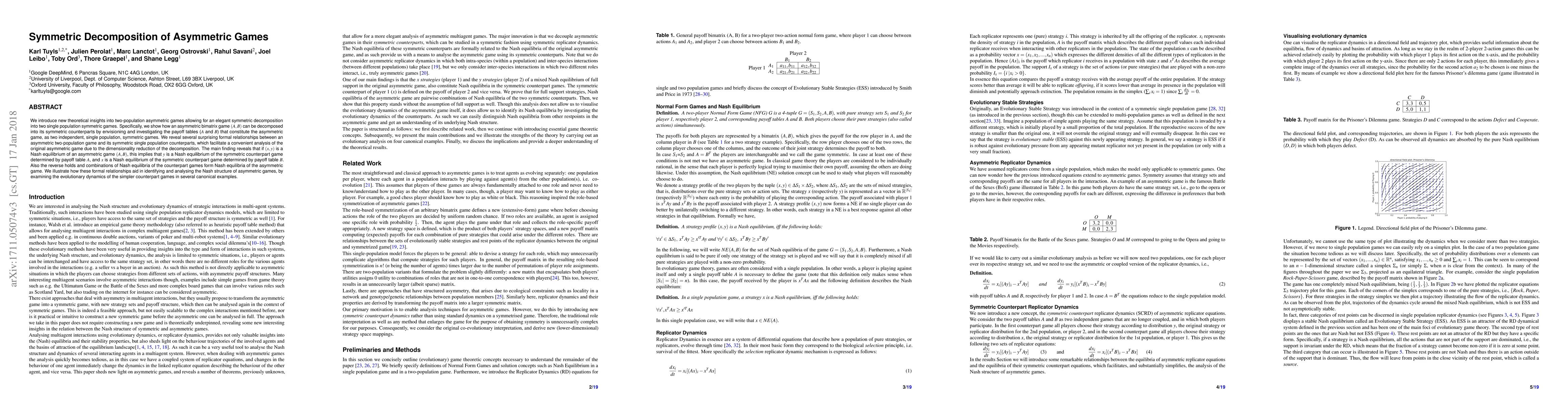 We introduce new theoretical insights into two-population asymmetric games allowing for an elegant symmetric decomposition into two single population symmetric games. Specifically, we show how an asymmetric bimatrix game (A,B) can be decomposed into its symmetric counterparts by envisioning and investigating the payoff tables (A and B) that constitute the asymmetric game, as two independent, single population, symmetric games. We reveal several surprising formal relationships between an asymmetric two-population game and its symmetric single population counterparts, which facilitate a convenient analysis of the original asymmetric game due to the dimensionality reduction of the decomposition. The main finding reveals that if (x,y) is a Nash equilibrium of an asymmetric game (A,B), this implies that y is a Nash equilibrium of the symmetric counterpart game determined by payoff table A, and x is a Nash equilibrium of the symmetric counterpart game determined by payoff table B. Also the reverse holds and combinations of Nash equilibria of the counterpart games form Nash equilibria of the asymmetric game. We illustrate how these formal relationships aid in identifying and analysing the Nash structure of asymmetric games, by examining the evolutionary dynamics of the simpler counterpart games in several canonical examples.