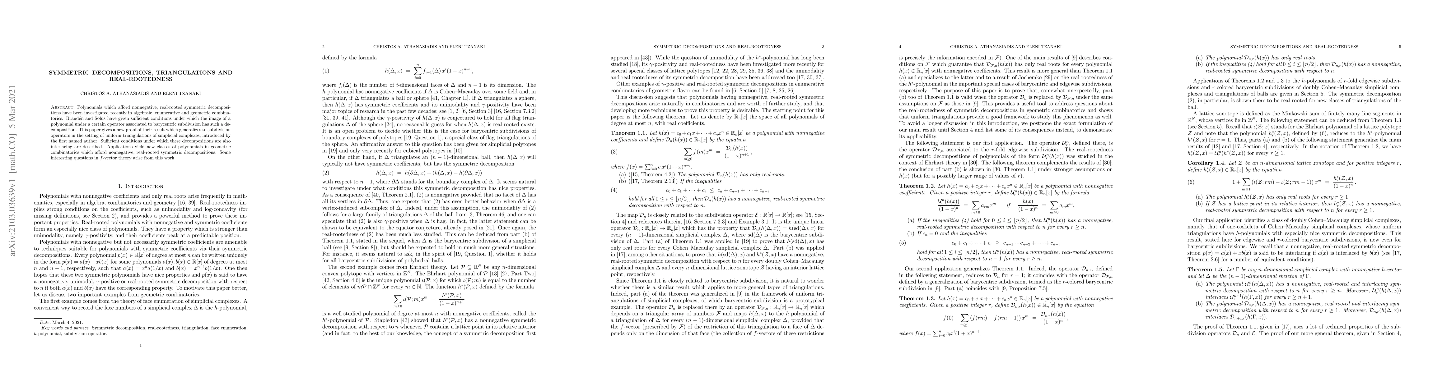 Polynomials which afford nonnegative, real-rooted symmetric decompositions have been investigated recently in algebraic, enumerative and geometric combinatorics. Br\"and\'en and Solus have given sufficient conditions under which the image of a polynomial under a certain operator associated to barycentric subdivision has such a decomposition. This paper gives a new proof of their result which generalizes to subdivision operators in the setting of uniform triangulations of simplicial complexes, introduced by the first named author. Sufficient conditions under which these decompositions are also interlacing are described. Applications yield new classes of polynomials in geometric combinatorics which afford nonnegative, real-rooted symmetric decompositions. Some interesting questions in $f$-vector theory arise from this work.