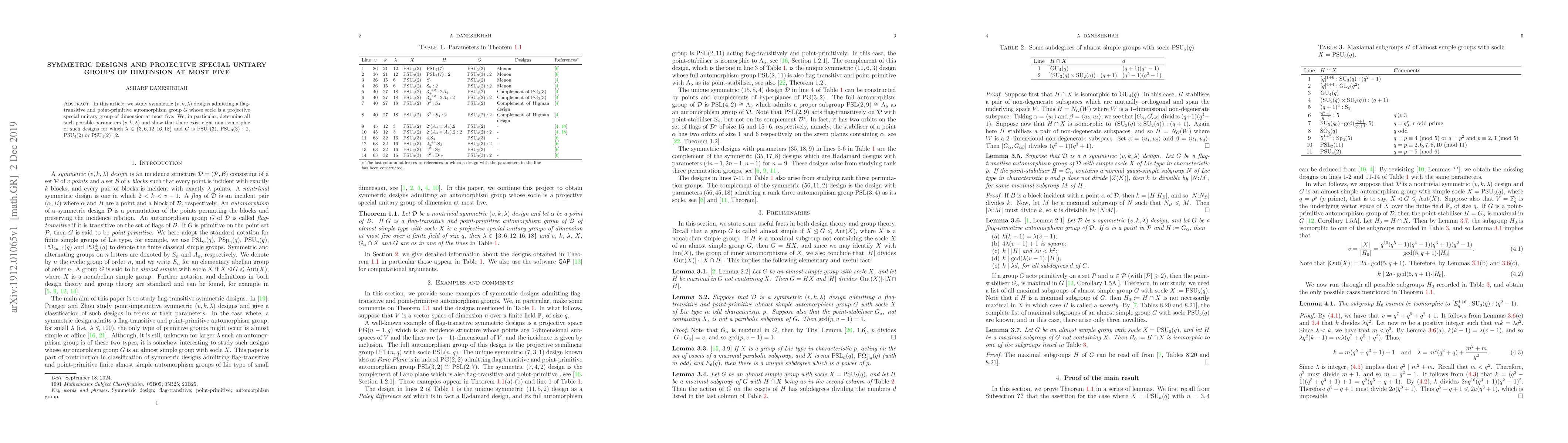 In this article, we study symmetric $(v, k, \lambda)$ designs admitting a flag-transitive and point-primitive automorphism group $G$ whose socle is a projective special unitary group of dimension at most five. We, in particular, determine all such possible parameters $(v, k, \lambda)$ and show that there exist eight non-isomorphic of such designs for which $\lambda\in\{3,6,12, 16, 18\}$ and $G$ is $PSU_{3}(3)$, $PSU_{3}(3):2$, $PSU_{4}(2)$ or $PSU_{4}(2):2$.