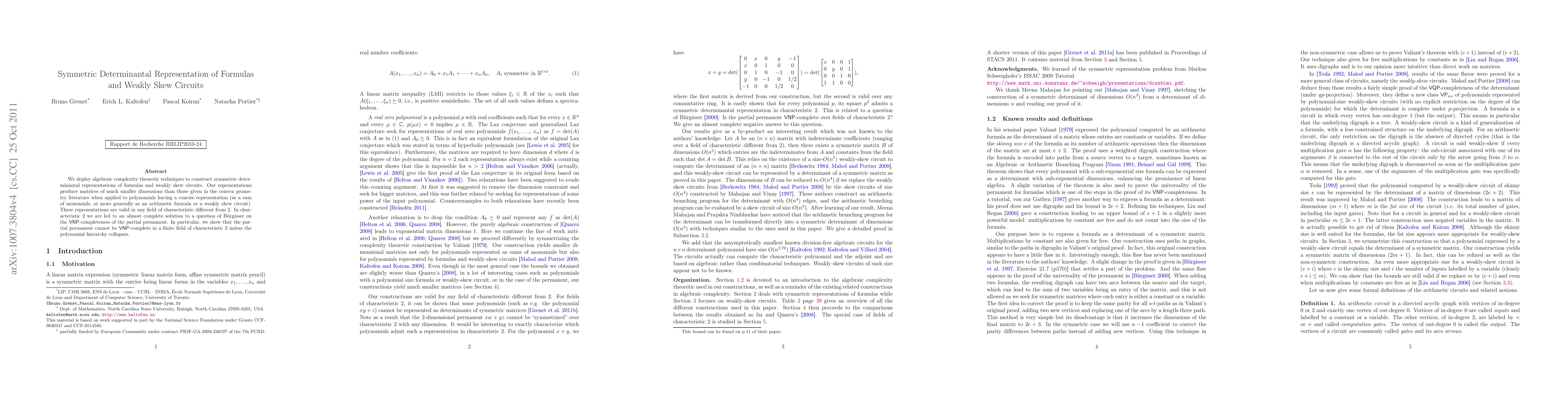 This paper presents algebraic complexity techniques to create symmetric determinantal representations for formulas and weakly skew circuits, resulting in significantly smaller matrices compared to existing methods. It also addresses the VNP-completeness of the partial permanent in characteristic 2, showing it cannot be VNP-complete unless the polynomial hierarchy collapses.