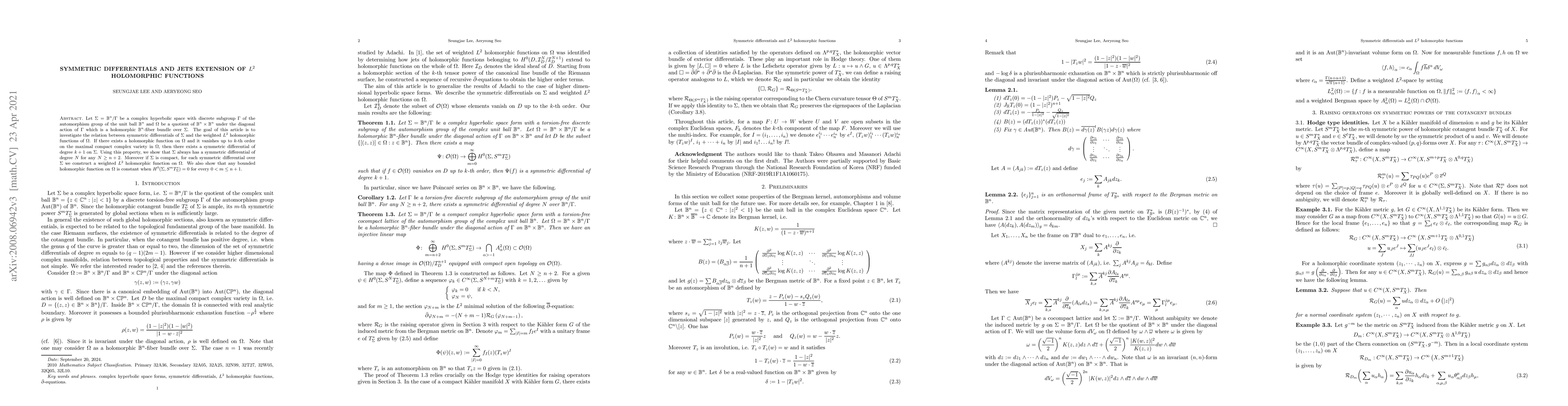 This paper explores the connection between symmetric differentials on complex hyperbolic space $\Sigma$ and weighted $L^2$ holomorphic functions on $\Omega$. It demonstrates that the existence of a holomorphic function on $\Omega$ vanishing up to $k$-th order implies the existence of a symmetric differential of degree $k+1$ on $\Sigma$, leading to the conclusion that $\Sigma$ always possesses a symmetric differential of degree $N$ for any $N \geq n+2$.