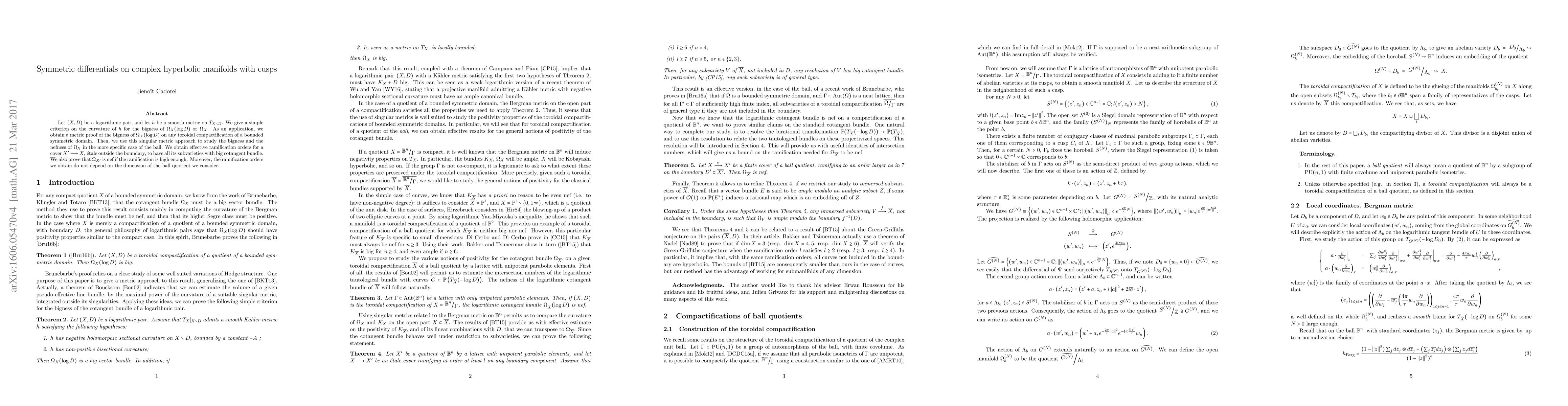Let $(X, D)$ be a logarithmic pair, and let $h$ be a singular metric on the tangent bundle, smooth on the open part of $X$. We give sufficient conditions on the curvature of $h$ for the logarithmic and the standard cotangent bundles to be big. As an application, we give a metric proof of the bigness of logarithmic cotangent bundle on any toroidal compactification of a bounded symmetric domain. Then, we use this singular metric approach to study the bigness and the nefness of the standard tangent bundle in the more specific case of the ball. We obtain effective ramification orders for a cover $X' \longrightarrow X$, \'{e}tale outside the boundary, to have all its subvarieties with big cotangent bundle. We also prove that the standard tangent bundle of such a cover is nef if the ramification is high enough. Moreover, the ramification orders we obtain do not depend on the dimension of the quotient of the ball we consider.