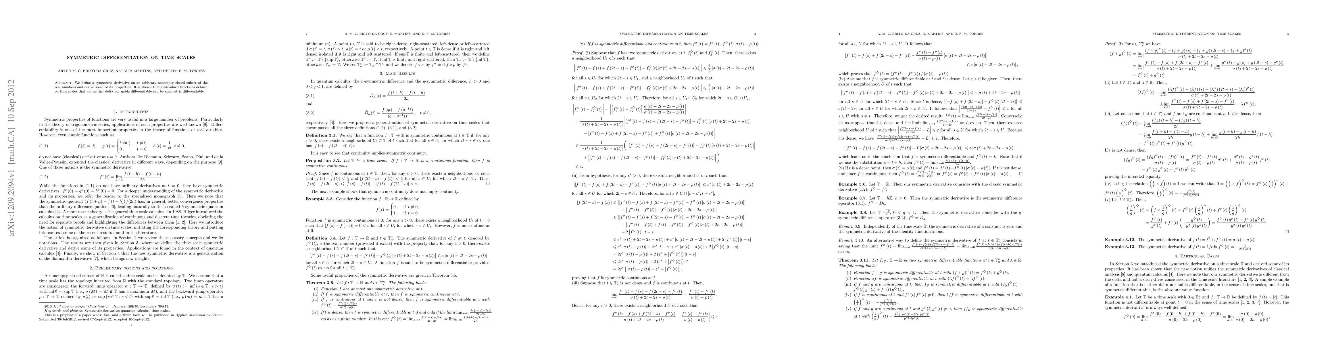 We define a symmetric derivative on an arbitrary nonempty closed subset of the real numbers and derive some of its properties. It is shown that real-valued functions defined on time scales that are neither delta nor nabla differentiable can be symmetric differentiable.