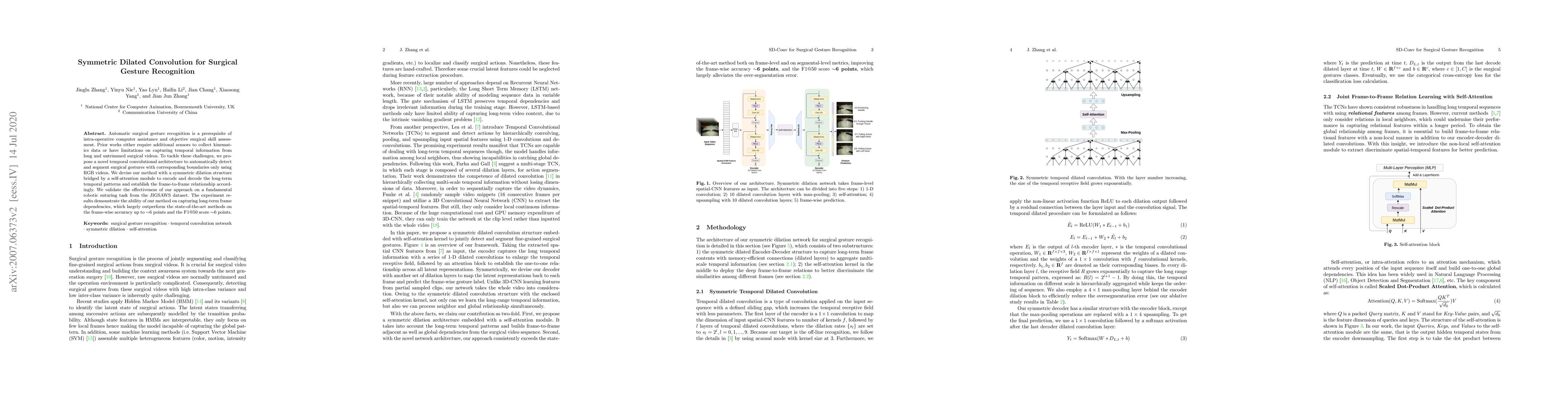 This paper proposes a novel temporal convolutional architecture using symmetric dilated convolution and self-attention to recognize surgical gestures from RGB videos without additional sensors. The method captures long-term temporal dependencies and outperforms state-of-the-art in robotic suturing tasks on the JIGSAWS dataset.