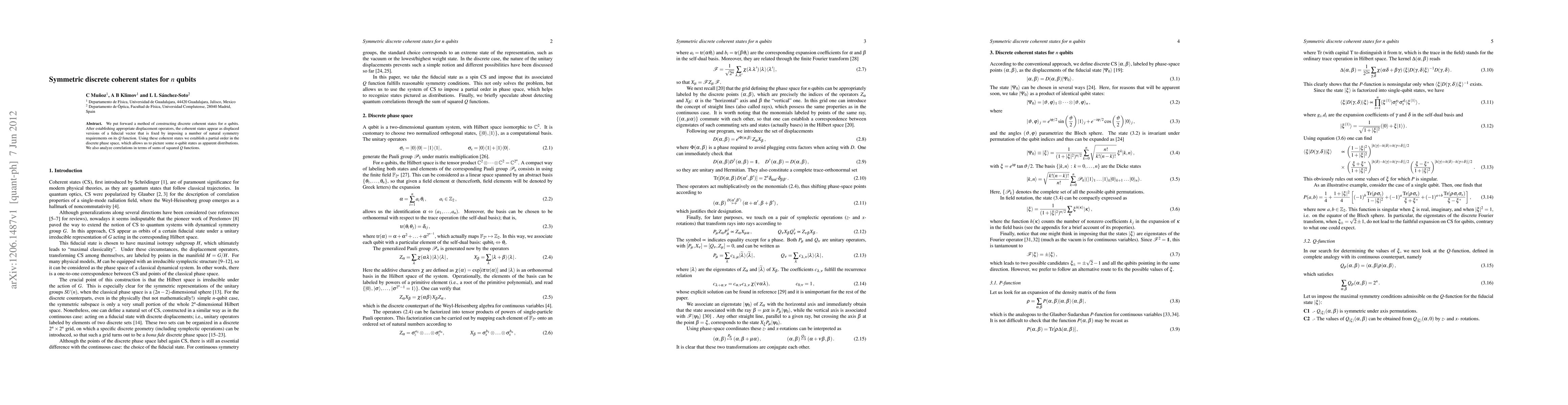 This paper proposes a method to construct symmetric discrete coherent states for n qubits using displacement operators and symmetry requirements. It establishes a partial order in the discrete phase space and analyzes correlations through sums of squared Q-functions.