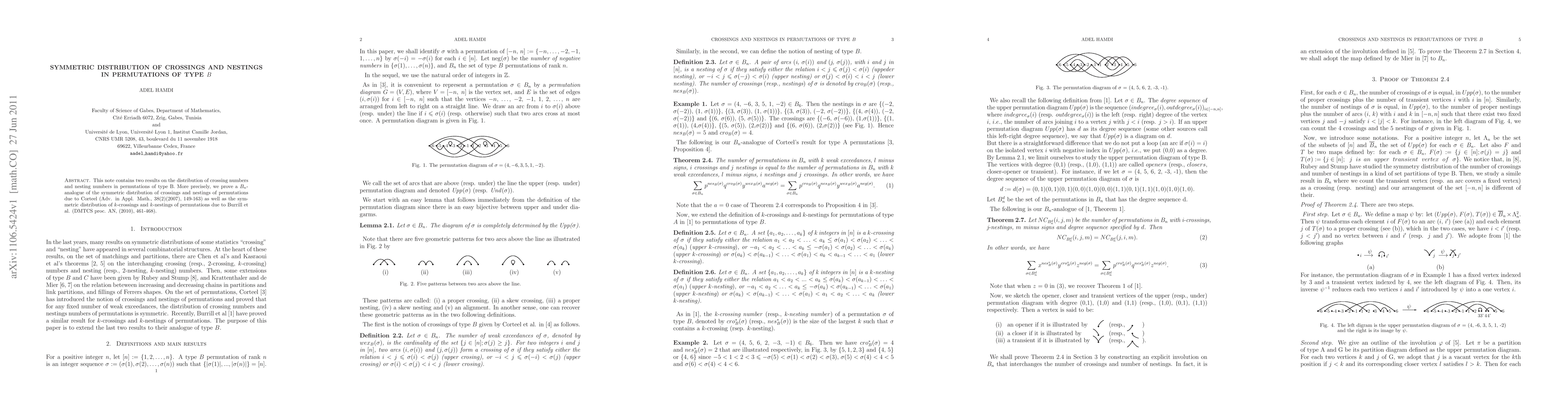 This research proves two results regarding the distribution of crossings and nestings in permutations of type B, establishing a Bn-analogue of symmetric distribution for crossings and nestings (Corteel, 2007) and symmetric distribution of k-crossings and k-nestings (Burrill et al., 2010).