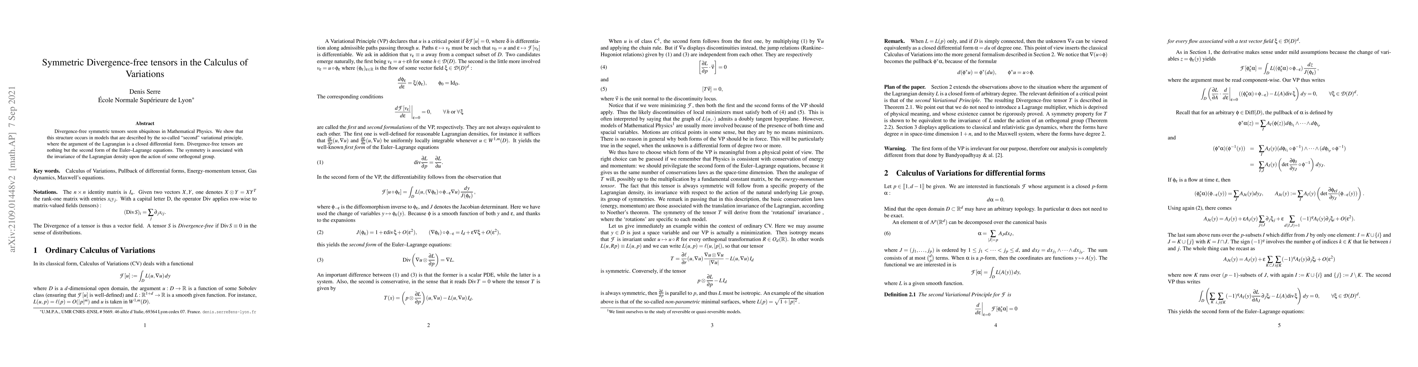 Divergence-free symmetric tensors seem ubiquitous in Mathematical Physics. We show that this structure occurs in models that are described by the so-called "second" variational principle, where the argument of the Lagrangian is a closed differential form. Divergence-free tensors are nothing but the second form of the Euler--Lagrange equations. The symmetry is associated with the invariance of the Lagrangian density upon the action of some orthogonal group.