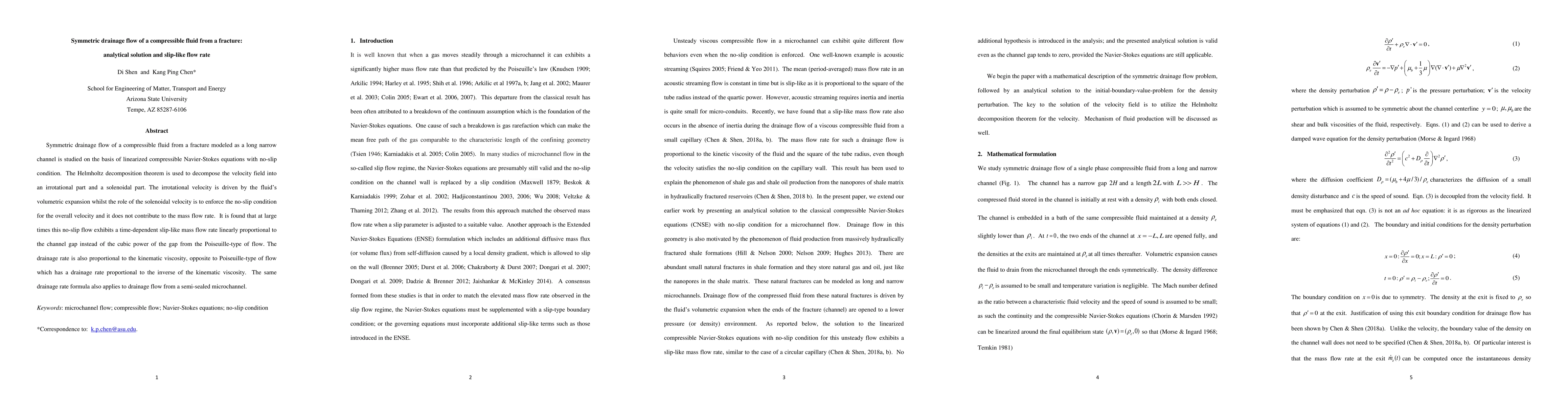 This paper presents an analytical solution for symmetric drainage flow of a compressible fluid from a fracture, revealing a slip-like flow rate that deviates from traditional Poiseuille flow. The study finds that the drainage rate is proportional to the channel gap and kinematic viscosity, rather than the inverse of the kinematic viscosity typically observed in incompressible flow.