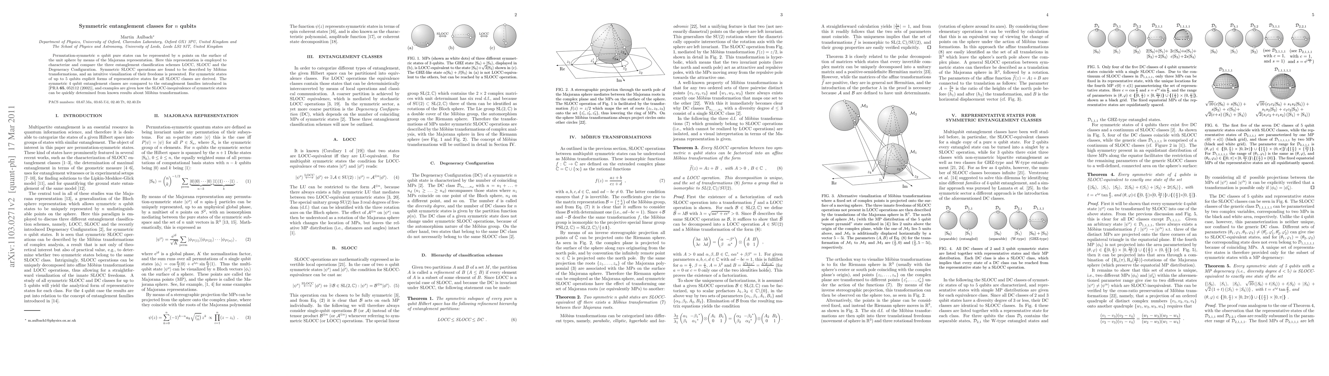 The paper employs the Majorana representation to characterize and compare three entanglement classification schemes: LOCC, SLOCC, and Degeneracy Configuration for symmetric n-qubit pure states.