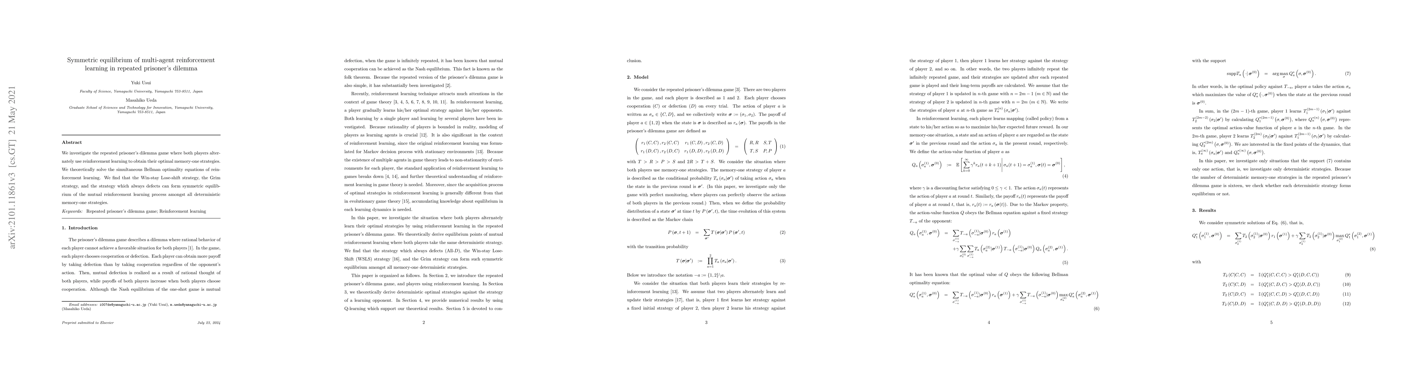 This paper explores the repeated prisoner's dilemma using reinforcement learning, finding that symmetric equilibria can emerge among various memory-one strategies, including Win-stay Lose-shift, Grim, and always defecting. Theoretical solutions to the reinforcement learning's Bellman optimality equations support these findings.