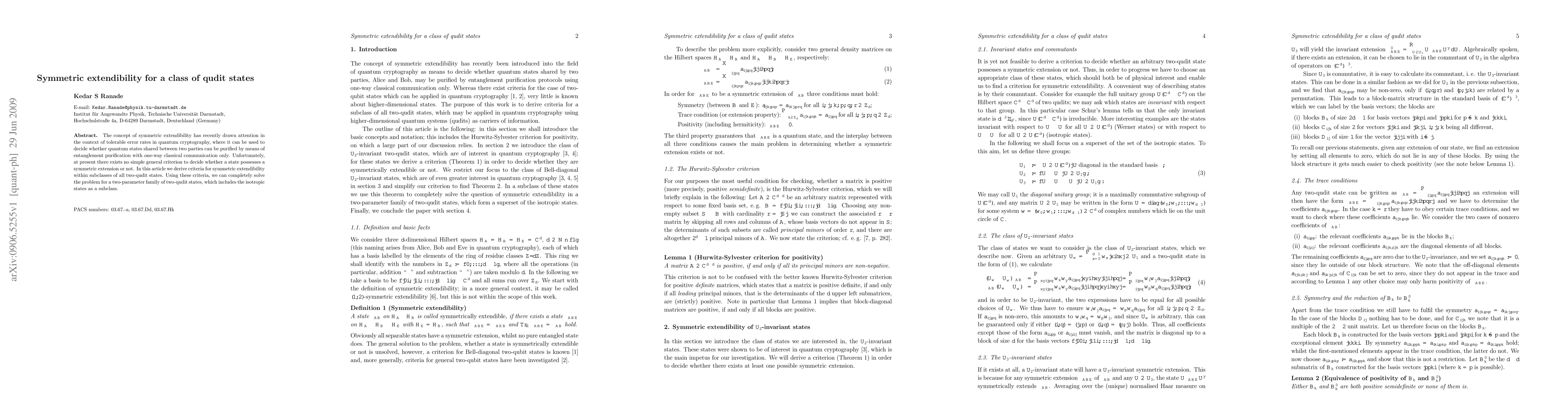 This paper derives criteria for symmetric extendibility within subclasses of two-qudit quantum states, providing a complete solution for a two-parameter family that includes isotropic states, which is significant for quantum cryptography and entanglement purification.