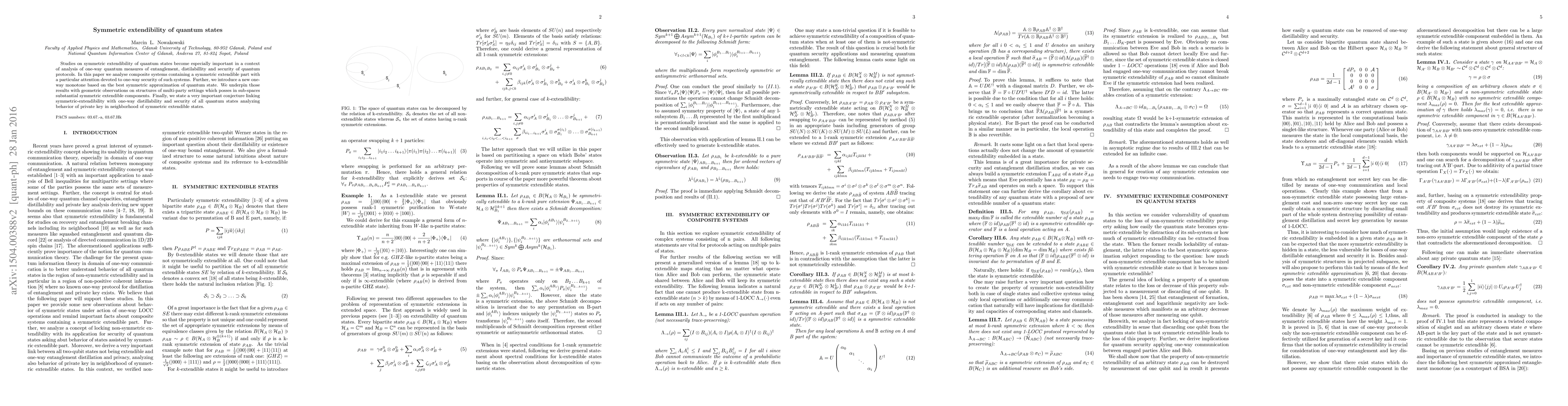 This paper investigates the symmetric extendibility of quantum states, focusing on its implications for one-way measures of entanglement, distillability, and security. It introduces a new one-way monotone based on the best symmetric approximation and proposes a significant conjecture linking symmetric extendibility with one-way distillability and security, particularly in the context of private key behavior near symmetric extendible states.