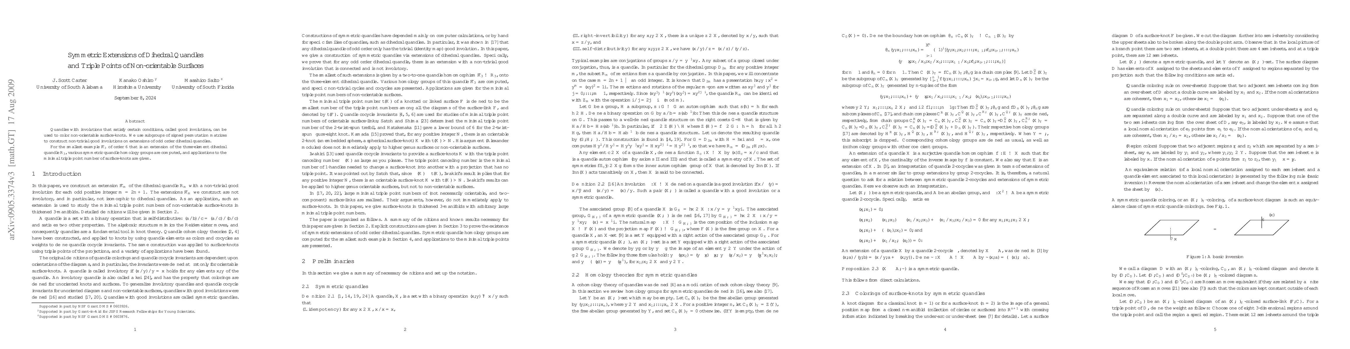 This paper constructs non-trivial good involutions on symmetric extensions of odd order dihedral quandles using subgroups of signed permutation matrices. It computes symmetric quandle homology groups for the smallest order 6 example and explores applications to the minimal triple point number of non-orientable surface-knots.