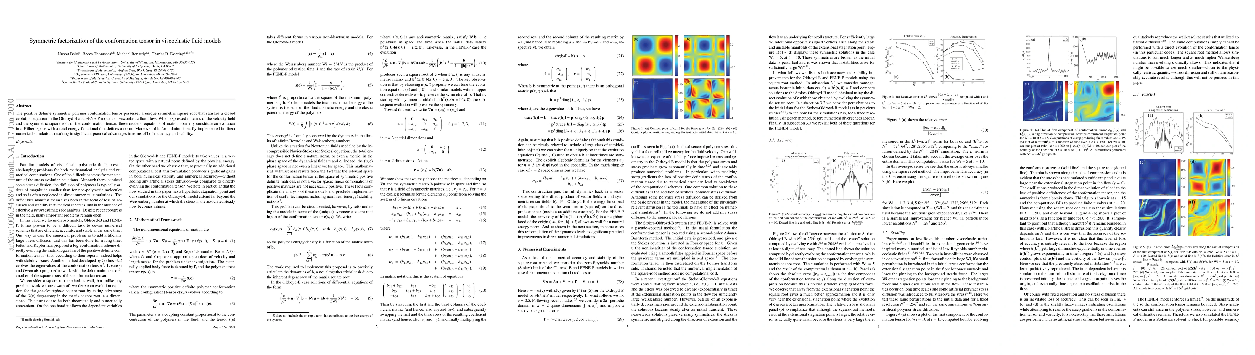 The paper discusses the symmetric factorization of the polymer conformation tensor in viscoelastic fluid models, revealing a unique symmetric square root that simplifies the Oldroyd-B and FENE-P equations. This formulation enhances accuracy and stability in direct numerical simulations.