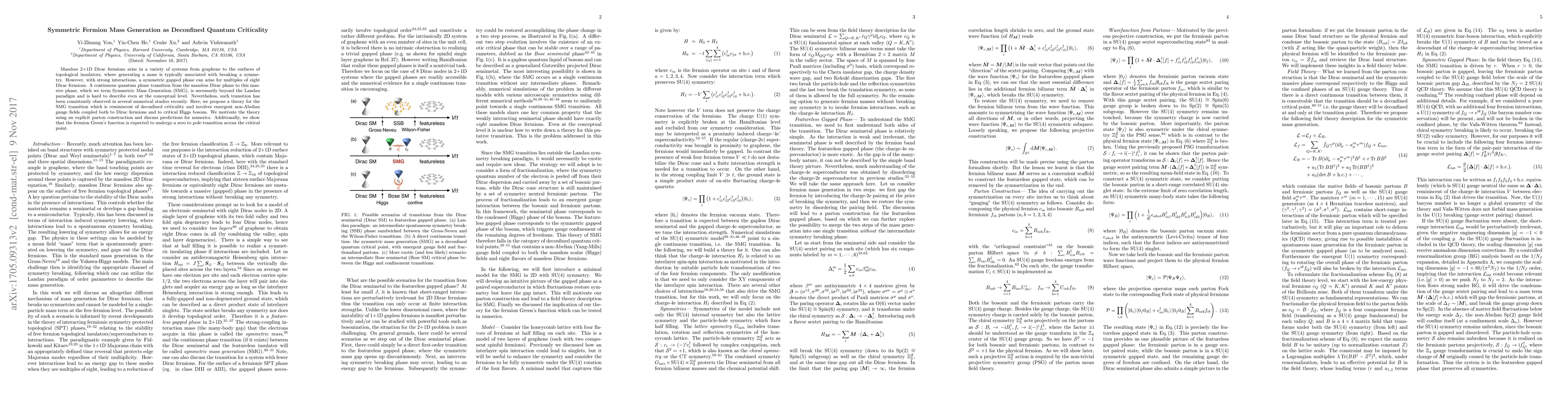 This paper proposes a theory for symmetric mass generation (SMG) in 2+1D Dirac fermions, suggesting that SMG can occur via a quantum phase transition akin to deconfined criticality, involving emergent non-Abelian gauge fields and critical Higgs bosons. The authors provide a parton construction to motivate their theory and predict a transition in the fermion Green's function from zero to pole at the critical point.