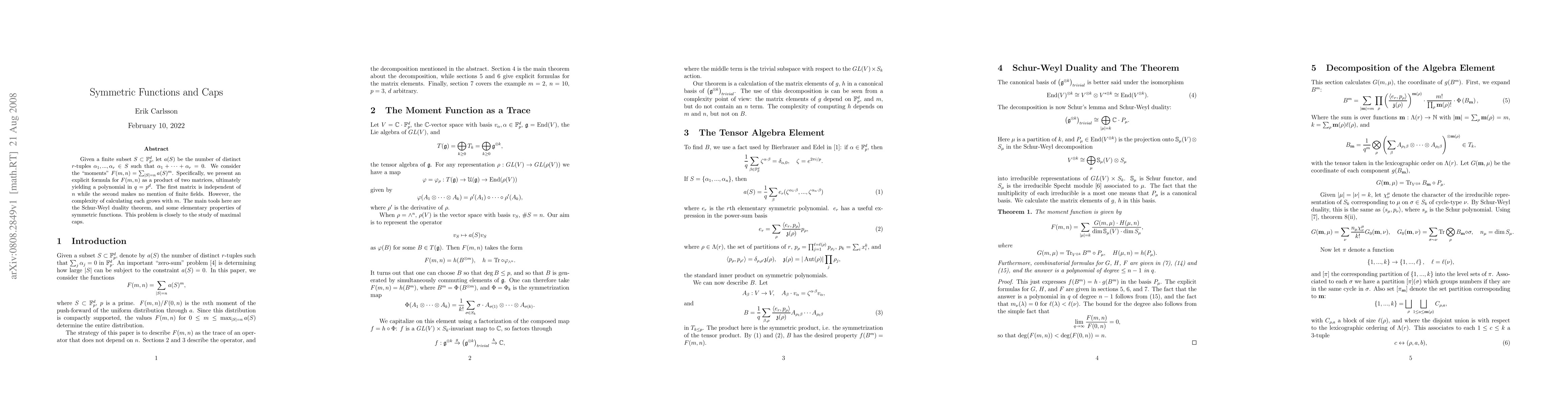 Given a finite subset S in F_p^d, let a(S) be the number of distinct r-tuples (x_1,...,x_r) in S such that x_1+...+x_r = 0. We consider the "moments" F(m,n) = sum_|S|=n a(S)^m. Specifically, we present an explicit formula for F(m,n) as a product of two matrices, ultimately yielding a polynomial in q=p^d. The first matrix is independent of n while the second makes no mention of finite fields. However, the complexity of calculating each grows with m. The main tools here are the Schur-Weyl duality theorem, and some elementary properties of symmetric functions. This problem is closely to the study of maximal caps.