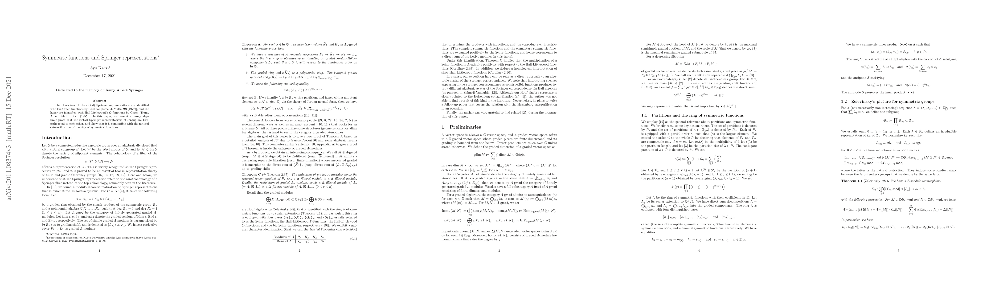 The characters of the (total) Springer representations are identified with the Green functions by Kazhdan [Israel J. Math. {\bf 28} (1977)], and the latter are identified with Hall-Littlewood's $Q$-functions by Green [Trans. Amer. Math. Soc. (1955)]. In this paper, we present a purely algebraic proof that the (total) Springer representations of $\mathop{GL} ( n )$ are $\mathrm{Ext}$-orthogonal to each other, and show that it is compatible with the natural categorification of the ring of symmetric functions.