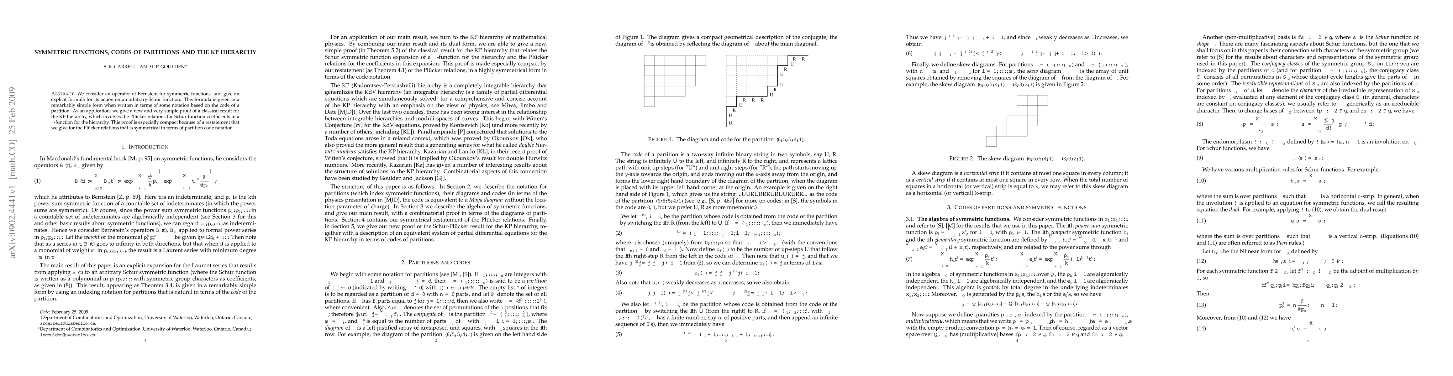 The paper provides an explicit formula for Bernstein's operator on Schur functions using partition code notation, leading to a simple proof of classical results regarding the KP hierarchy and the Plucker relations for Schur function coefficients.
