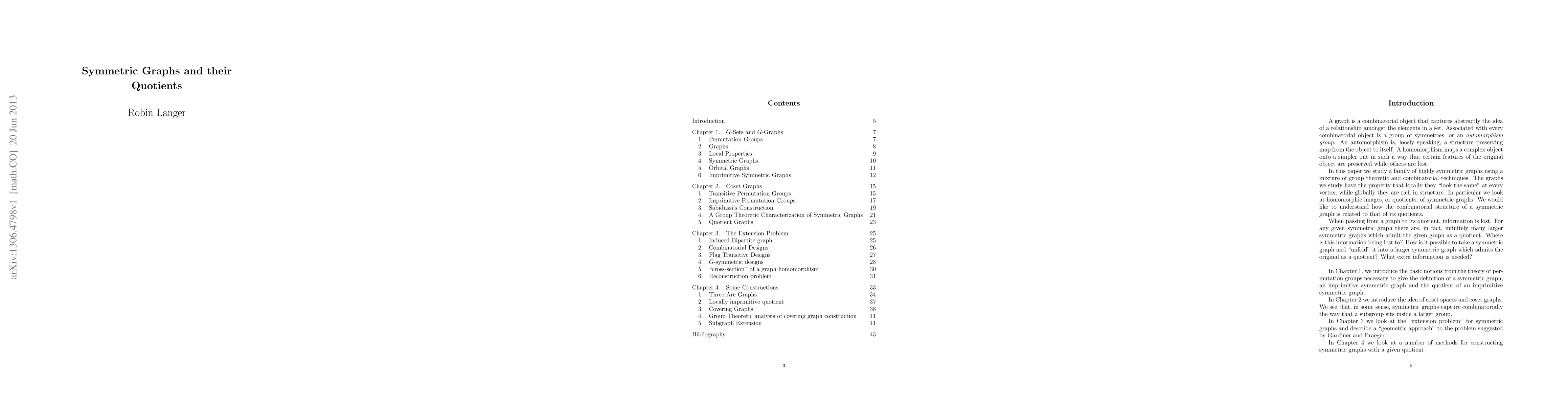 In this expository paper we describe a group theoretic characterization of arc-transitive graphs and their quotients. When passing from a symmetric graph to its quotient, much information is lost, but some of this information may be recovered from a certain combinatorial design on the blocks, as well as a bipartite graph between the blocks. We address the "extention problem" which asks, when is this additional information sufficient to recover the original graph?